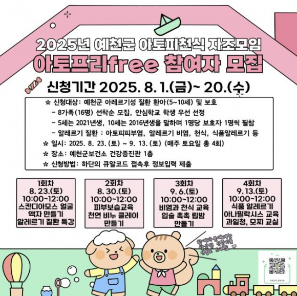 예천군은 8월 23일부터 9월 13일까지 알레르기 질환을 앓고 있는 아동과 보호자를 위한 아토피‧천식 자조모임 ‘아토프리free’ 프로그램을 매주 토요일, 총 4회에 걸쳐 운영한다.이번 자조모임은 5세부터 10세까지의 아동과 부모를 대상으로, 알레르기 질환에 대한 올바른 이해를 돕고 특히 교육과 체험 프로그램으로 구성되어 아이와 부모가 함께 참여하며 즐겁게 배울 수 있는 시간이 될 것으로 기대된다.참여신청 기간은 8월 1일부터 20일까지며, 모집인원은 선착순 8가족이다. 아토피·천식 안심학교에 재학중인 아동을 우선 선발하며, 알레르기 질환에 관심 있는 지역 주민도 신청할 수 있다. 참가비는 무료이며, 참여 가족 모두에게 기념품이 제공된다.프로그램은 알레르기 질환으로 고통받는 아동과 가족들이 함께 공감하고 소통하며 질환을 관리할 수 있도록 교육 및 다양한 체험으로 구성되어 있다. 경상북도 아토피천식교육정보센터의 ‘알레르기 질환의 이해’ 특강을 시작으로 △스칸디아모스 얼굴 액자 만들기 △천연 수제 비누 만들기 △립밤 만들기 △과일청과 과일 모찌 만들기 등이 주요 내용이다.안남기 보건소장은 “알레르기 질환은 올바른 관리가 무엇보다 중요하다”며, “이번 자조모임이 질환에 대한 이해를 높이고 가족 간 유대관계도 높이는 뜻깊은 시간이 될 수 있도록 많은 관심과 참여를 부탁드린다” 고 전했다.