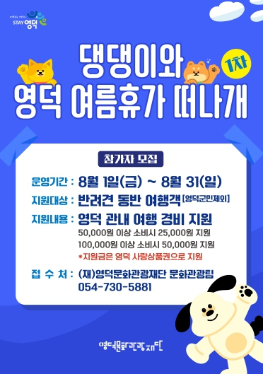 (재)영덕문화관광재단은 8월 한달 간, 지원금을 받으며 반려견과 함께 여행하는 프로그램 `댕댕이와 함께 영덕 여름휴가 떠나개`의 참가 신청을 받는다. ‘블루로드 반려견 동반 트래킹 프로그램’의 일환으로 진행되는 본 사업은 최근 1,400만 명에 달하는 펫펨족(반려동물을 가족 구성원으로 인식하는 인구)의 증가 추세에 따라 관광의 주요 소비층으로 급부상하고 있는 반려견 동반 가구를 대상으로 한다. 영덕 관광 인구 유입을 위해 영덕군 외 타 지역에 주소를 둔 사람이면 누구나 참여 가능하다. 프로그램 운영 기간은 8월 1일부터 31일까지이며 최대 50팀을 모집하는데 참가자는 운영 기간 내에 원하는 날짜를 자유롭게 선택해 여행할 수 있다. 지원금을 받기 위해서는 필수 미션 두 가지를 수행해야 한다. 즉 블루로드 코스 내 관광지 12곳 중 3곳 이상을 반려견과 함께 방문하여 인증사진을 촬영, SNS에 업로드하고 영덕 관내 음식점에서 1끼 이상 식사를 한 영수증을 제출하면 된다. 미션 완료 후 최근 개관한 영덕 블루로드 쉼터(영덕읍 해맞이길247)에서 정산신청서를 작성하면 즉석에서 지원금을 수령할 수 있다. 지원금은 지역경제 활성화를 위해 영덕사랑상품권으로 지급되며 소비 금액에 따라 지원금이 달라지는데, 100,000원 이상 소비 시 50,000원. 50,000원 이상 소비 시에는 25,000원을 지역사랑상품권으로 돌려받을 수 있다. 본 프로그램은 지원금과 함께 SNS 해시태그 이벤트도 마련했다. 필수과제를 SNS에 게시한 후 ‘좋아요’수가 가장 많은 참가자에게는 추가로 반려견 동반 숙박권 등 푸짐한 선물도 주어진다. 재단 관계자는 “작년 재단에서 진행한 영덕DMO사업 중 `대게좋은생활_댕댕이와 함께하는 영덕여행`이 큰 호응을 얻었다”며 “작년의 경험을 토대로 이번 프로그램을 반드시 성공시켜 영덕군이 반려동물 친화도시로 인식될 수 있도록 노력하겠다”는 포부를 밝혔다. 참가 신청은 네이버폼을 통해 할 수 있고, 미션 수행을 위한 블루로드 관광지 12곳 등 자세한 내용은 (재)영덕문화관광재단 홈페이지 공지사항에서 확인할 수 있다.