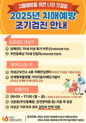 의성군은 치매 조기 발견과 중증화 예방을 위해 2025년 하반기부터 75세 진입자 및 치매고위험군을 대상으로 집중적인 조기검진을 지원한다고 밝혔다. 지난해 의성군치매안심센터에서는 총 3,688건의 인지선별검사를 시행했으며 최근 1년 이내 검사를 받지 않은 인지저하자 및 경도인지장애자 중 치매안심센터에 등록된 고위험군 1,311명을 선별하여 문자 및 우편을 통해 치매 조기검진 안내물을 발송했다. 검진은 의성군보건소 4층 치매안심센터와 안계행복플랫폼 내 기억키움치매단기쉼터에서 받을 수 있으며, 인지선별검사 결과에 따라 협약병원에서 진단검사 및 감별검사를 무료로 지원받을 수 있다. 또한, 치매 진단을 받을 경우 치매안심센터에 등록하면 기저귀, 물티슈 등 조호물품을 비롯해 배회 감지기, 인식표, 인지중재 프로그램 등 다양한 지원을 제공받을 수 있다.김주수 의성군수는 “치매는 조기에 발견하고 예방하면 충분히 관리할 수 있는 질환”이라며 “적극적인 조기검진을 통해 군민 모두가 건강하고 존엄한 노후를 보낼 수 있도록 최선을 다하겠다”고 말했다.