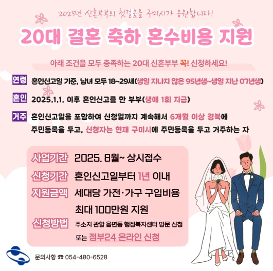 구미시는 8월 1일부터 20대 청년층의 결혼 초기 정착을 돕기 위해 ‘20대 결혼축하 혼수비용 지원사업’을 시행한다. 세대당 최대 100만 원의 가전·가구 구입비를 지원하기 위해 164백만 원의 예산을 확보했고, 상대적으로 자금이 부족한 청년 신혼부부의 경제적 부담을 덜겠다는 취지다. 이번 사업은 혼인과 함께 구미시에 정착한 20대 청년 신혼부부를 대상으로 하며, 아래 세 가지 요건을 모두 충족해야 신청할 수 있다.첫째, 연령 요건은 혼인신고일 기준으로 남녀 모두 18세 이상 29세 이하(생일 지나지 않은 1995년생~생일 지난 2007년생)여야 한다.둘째, 혼인 요건은 2025년 1월 1일 이후 혼인신고를 완료한 부부로, 생애 1회에 한해 지원 가능하다.셋째, 거주 요건은 남녀 모두 혼인신고일을 포함해 신청일까지 계속해서 6개월 이상 경북에 주민등록을 두고 있어야 하며, 신청자는 현재 구미시에 주민등록을 두고 실거주 중이어야 한다.신청은 혼인신고일로부터 1년 이내에 가능하며, 주소지 관할 읍·면·동 행정복지센터를 방문하거나 정부24(www.gov.kr)를 통해 온라인으로도 신청할 수 있다.구비서류는 △신청서 △가전·가구 구입 영수증(혼인신고일 기준 1년 전부터 신청일까지 유효) △주민등록초본(주소변동 이력 포함) 부부 각 1부 △혼인관계증명서(상세) △통장 사본 등이다.한편 구미시는 지난 4월부터 올해 혼인신고를 완료한 30세~45세 청년근로자를 대상으로도 최대 100만원(구미사랑상품권)의 결혼 장려금을 지원하고 있다. 이에 따라 20대는 ‘혼수비용 지원사업’을, 30세~45세 근로자 신혼부부는 ‘청년근로자 결혼장려금 지원 사업’을 통해 각각 맞춤형 혜택을 받을 수 있다.김장호 구미시장은 “청년층의 결혼은 지역의 미래를 결정짓는 중요한 문제다”라며 “이번 혼수비 지원이 실질적인 결혼 장려책이 되길 기대한다. 앞으로도 청년들이 결혼과 출산을 주저하지 않도록 다양한 맞춤형 정책을 확대해나가겠다”고 했다.