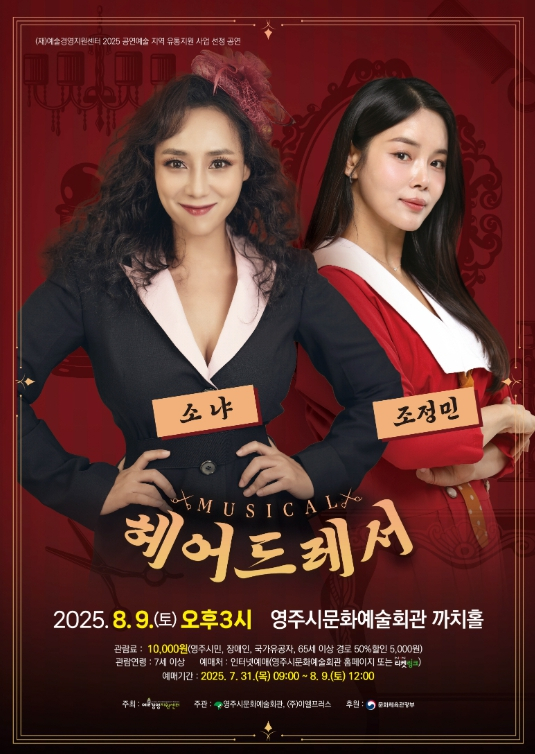 영주시는 시민의 문화 향유 기회를 확대하기 위해 오는 8월 9일 오후 3시, 영주시문화예술회관 까치홀에서 창작 뮤지컬 를 공연한다고 밝혔다.이번 공연은 1930년대 우리나라 최초의 여성 미용사를 주인공으로, 꿈을 향한 도전과 용기, 그리고 자립의 여정을 그린 작품이다. 소냐, 조정민 등 실력파 뮤지컬 배우들이 출연하여 섬세하고 깊이 있는 무대를 선보일 예정이며, 여성의 자립과 변화의 시대상을 감성적으로 풀어내 전 세대 관객들에게 진한 울림을 전달할 것으로 기대된다.특히 이 공연은 (재)예술경영지원센터가 주최하고 문화체육관광부가 후원하는 ‘2025 공연예술 지역 유통지원 사업’에 영주시가 선정되어 추진되는 것으로, 수준 높은 창작 뮤지컬을 시민들에게 선보일 수 있는 기회가 될 전망이다.관람권 예매는 7월 31일 오전 9시부터 8월 9일 정오까지 영주시문화예술회관 현장 또는 누리집, 티켓링크를 통해 할 수 있다. 전 좌석은 1만 원(초등학생 이상 관람 가능)이며, 영주시민, 장애인, 국가유공자, 만 65세 이상 경로우대자는 50% 할인된 금액으로 관람할 수 있다.공연과 관련된 자세한 내용은 영주시문화예술회관 누리집, 네이버 밴드(까치홀) 또는 문화예술회괸로 문의하면 안내받을 수 있다.