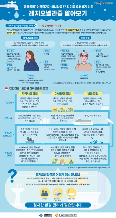 울진군은 레지오넬라증 감염을 선제적 예방하기 위해 8월 한 달간 다중이용시설을 대상으로 레지오넬라균 환경 검사를 집중 실시한다. 레지오넬라증은 레지오넬라균에 의해 발병하는 제3급 호흡기 감염병으로 냉방병 혹은 인플루엔자와 비슷하게 발열, 오한, 두통, 기침 등이 주 증상이며 대증요법, 항생제 등으로 치료가 가능하지만 만성폐질환자, 흡연자, 면역저하자 등이 레지오넬라균에 감염 될 경우 치명률이 급격히 상승할 수 있으므로 주의와 예방이 필요하다. 연일 폭염주의보와 경보를 웃돌며 고온 다습한 날씨가 이어지면서 에어컨 가동이 필수인 여름철은 레지오넬라균이 번식하기 좋은 환경으로 이에 대한 관리가 필요하다. 특히 대형건물의 냉각탑수, 급수시설, 욕조수, 분수 등이 레지오넬라균에 오염되어 호흡기로 흡입되면 집단 발병의 원인이 될 수 있다. 이에 울진군은 선제적 예방조치로 지역 내 의료기관, 요양시설, 호텔, 온천 등 총 7개소를 대상으로 환경 검사를 실시한다. 경상북도 보건환경연구원과 협업하여 진행하며 추후 환경 검사 결과를 토대로 균의 검출 정도에 따라 해당 시설 관리자에게 사후 관리 및 소독, 청소, 재검사 등의 조치사항을 통보할 예정이다. 손병복 울진군수는“다중이용시설을 이용하는 주민들이 안전하고 건강한 여름을 날 수 있도록 냉각탑 및 급수시설 등의 주기적인 청소, 소독, 수온 및 소독제 잔류 농도 관리 등 특별한 관심과 노력이 필요하다”며“군은 앞으로도 감염병 예방에 총력을 기울이겠다”라고 전했다.