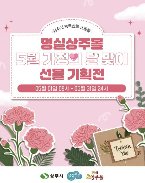상주시가 운영하는 농특산물 온라인 쇼핑몰 ‘명실상주몰’에서 5월 가정의 달을 맞아 5월 1일부터 31일까지 특별 할인행사를 진행한다. 이번 ‘가정의 달’ 선물 기획전은 상주의 우수 농특산물 선물세트를 최대 30% 할인된 가격에 만나볼 수 있으며, 특히 매주 수요일에는(7일, 14일, 21일, 28일) 수요특가 ‘수상하데이’ 이벤트를 통해 매회 4개 품목을 50% 특별가로 제공해 농특산물을 저렴하게 구매할 좋은 기회다.또한, 신규회원 가입자와 구매후기 리뷰 작성자를 대상으로 5,000원 할인 쿠폰을 지급하는 프로모션도 동시에 진행하여 고객혜택을 더욱 확대할 예정이다.이번 기획전은 명실상주몰 자체몰 뿐 아니라, 네이버스토어 ‘나란히가게’ 등 제휴쇼핑몰에서도 상주 농특산물 기획전이 운영되며, 상주 농특산물의 전국 소비자 접근성을 높이는 계기가 될 것으로 기대된다.상주시 관계자는 “가정의 달을 맞아 감사한 마음을 전할 수 있는 좋은 기회”라며 “건강하고 정성 가득한 상주 농특산물로 따뜻한 선물의 마음을 전하시길 바란다”고 전했다.