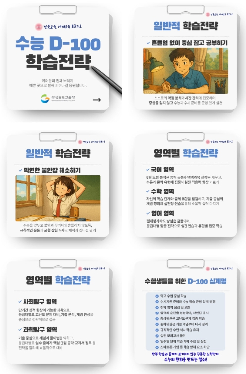 경북교육청은 5일, 2026학년도 대학수학능력시험 D-100일을 맞아, 수험생들에게 실질적인 도움과 응원을 전하기 위해 응원 영상과 수능 학습 전략 자료를 제작해 도내 각 고등학교에 배부했다고 밝혔다. 이번에 제공된 영상과 자료는 도내 고등학교에 재학 중인 수험생들에게 심리적 안정과 학습 동기를 부여하고, 효율적인 학습 설계를 돕기 위해 마련됐다. 특히 최근 수능 응시생 수 증가와 수능 최저학력기준 강화 등으로 인해 수능의 중요성이 더욱 주목받는 상황에서, 교육청 차원의 체계적 지원이 큰 의미를 가진다. 응원 영상에는 임종식 경북교육감이 직접 출연해 “여러분의 땀과 노력이 예쁜 꽃으로 활짝 피어나기를 응원한다”라며 따뜻한 메시지를 전했다. 또, “마지막까지 자신을 믿고 포기하지 않는다면 반드시 의미 있는 결실을 맺을 것”이라며 모든 수험생의 노력을 진심으로 응원했다. 해당 영상은 경북교육청 공식 유튜브 채널 ‘맛쿨멋쿨TV’를 통해 공개되며, 학생들에게 안내될 예정이다. 이와 함께 경북진학지원센터가 제작해 보급한 이번 ‘수능 D-100 학습 전략 자료’는 △일반적 학습 전략 △영역별 학습 전략 △멘탈 관리와 수험생 조언 등으로 구성되어 있으며, 실제 수험생들의 학습 계획 수립과 스트레스 관리에 도움이 될 수 있도록 다양한 팁이 담겨 있다. 임종식 교육감은 “이번 영상과 자료가 수험생들에게 실질적인 도움이 되어, 남은 기간 동안 자신감을 갖고 수능 준비에 임할 수 있기를 바란다”라며 “앞으로도 진학지원센터를 중심으로 수험생 맞춤형 정보를 지속적으로 제공해 나갈 계획”이라고 밝혔다.