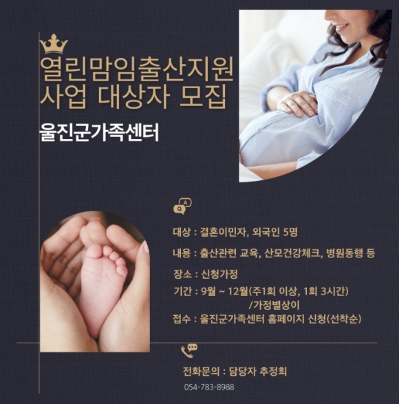 울진군은 8월 4일부터 결혼이민자 및 외국인 여성을 위한‘열린맘임신·출산 서비스지원사업’참여 대상자 5명을 모집한다. 이 사업은 임신중이거나 출산 후 24개월 이내인 다문화 산모를 대상으로 출산경험이 있는 결혼이민여성 1명이 맘코치로 주 1회 이상 가정방문을 통해 출산관련정보, 산후관리, 정서적지지, 병원 이용 안내 등 맞춤형 1:1서비스를 지원하는 사업으로 신청자는 무료로 진행된다. 맘코치는 이중언어 구사 능력과 출산 경험이 있는 결혼이민여성 중 전문 교육을 이수한 인력으로, 산모와 언어·문화적 공감대를 형성하며 실제적이고 정서적인 지원을 제공할 예정이다. 신청은 울진군가족센터 홈페이지를 통해 가능하며, 기타 자세한 사항은 울진군가족센터로 문의하면 된다. 손병복 울진군수는“다문화 가정이 지역사회의 일원으로서 안전하고 건강한 임신과 출산을 경험할 수 있도록 적극 지원하겠다”며“앞으로도 사각지대 없는 촘촘한 복지체계 구축에 최선을 다하겠다”라고 말했다.