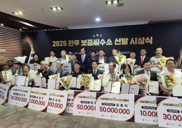 경상북도 축산기술연구소가 자체 생산한 씨수소 1두(KPN1707)가 7월 31일 열린 ‘2025년 한우 보증씨수소 선발 시상식’에서 선발지수 1위의 성적으로 보증씨수소로 선발됐다.안성 팜랜드에서 열린 이번 ‘2025년 한우 보증씨수소 선발 시상식’에서는 18두가 보증씨수소(KPN, Korean Proven Bull’s No.)로 선발됐으며, 경북도는 축산기술연구소 씨수소 1두와 도내 6군데 육종농가(상주, 김천, 문경, 영덕, 울진, 예천)에서도 보증씨수소로 선발됐다.이날 신규로 선발된 보증씨수소의 정액은 농협경제지주 한우개량사업소에서 8월부터 전국 한우농가에 판매하고, 한우 보증씨수소가 선발된 육종 농가는 씨수소의 능력에 따라 1천만원 ~ 5천만원까지 개량장려금을 차등 지급 받는다. 경상북도는 KPN1707 선발에 따른 인센티브로 개량장려금이 아닌 해당 씨수소 정액 50%(5만개)를 도내 시군 수요조사를 거쳐 한우 사육 농가에 내년부터 유상 공급할 예정이다.한우 보증씨수소 사업은 국가 주도의 한우 개량 사업으로 농림축산식품부의 주관하에 실시 중인 한우육종농가사업의 하나로 국립축산과학원, 농협경제지주 한우개량사업소와 광역자치단체(경북, 강원, 전북, 전남, 충남, 충북)의 도 단위 축산연구소가 사업에 참여하고 있다.보증씨수소 선발은 농촌진흥청 국립축산과학원이 국가 단위 한우 유전능력평가를 종합적으로 실시해, 가축개량협의회(한우분과)의 엄격한 심의와 평가를 거쳐 최종적으로 선발한다.한우의 능력검정 과정은 당대검정(28개월)과 후대검정(38개월)을 거치며, 최종 선발되기까지는 약 5.5년(약 66개월)이 걸린다.당대검정은 씨수소를 선발하기 위하여 선발대상 수소의 외모심사, 발육상태 등의 능력을 검정하는 과정이고, 후대검정은 당대검정을 통해 선발된 씨수소의 자손(그 중 수컷) 능력을 검정하는 것을 말한다.경상북도 축산기술연구소는 경북 한우의 우수성을 알리고, 도내 한우사육 농가에 우량 종축을 생산․보급하기 위해 1999년부터 지금까지 한우 보증씨수소 개발을 추진해 총 660두의 수소를 당대검정했으며, 그 중 47두가 후보씨수소로 선발됐다.선발된 47두의 후보씨수소 중 이번에 선발된 1두를 포함해 총 14두가 보증씨수소로 선발됐으며, 2두(KPN1812, KPN1919)가 후대검정 중에 있다이재식 경상북도 축산기술연구소 소장은 “한우 보증씨수소 개발사업은 한우 개량의 가장 근본이 되는 사업으로 이번에 선발된 보증씨수소 KPN1707은 연구소에서 배출한 최고의 보증씨수소인 KPN586과 비교해도 부족하지 않은 매우 우수한 유전능력을 보유해 약 150억원 이상의 추가 수익을 올릴 수 있을 것으로 예상된다”고 말했다.
