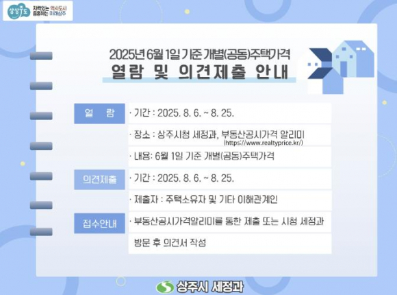 상주시는 2025년 6월 1일 기준 개별주택가격 및 공동주택가격에 대해 오는 8월 6일부터 8월 25일까지 열람 및 의견접수를 실시한다.이번 열람 대상은 개별주택 145호 및 공동주택(아파트, 연립, 다세대)이다.개별주택가격은 부동산공시가격알리미를 통해 직접 확인하거나 상주시청 세정과를 방문해 열람할 수 있다. 개별주택가격에 대하여 의견이 있는 주택소유자 및 법률상 이해관계인은 8월 25일까지 의견서를 제출하면 된다.접수된 의견은 상주시 부동산가격공시위원회의 심의를 거쳐 가격의 적정 여부를 재조사하며, 최종 결정된 개별주택가격은 9월 30일에 공시될 예정이다.또한 국토교통부가 주관하는 공동주택가격도 개별주택과 동일한 기간 동안 부동산공시가격알리미를 통해 열람 및 의견제출이 가능하다.위창성 세정과장은 “열람기간 동안 주택가격을 확인하고, 이의가 있을 경우 반드시 기한 내 의견을 제출해 주시기 바란다.”라고 말했다.