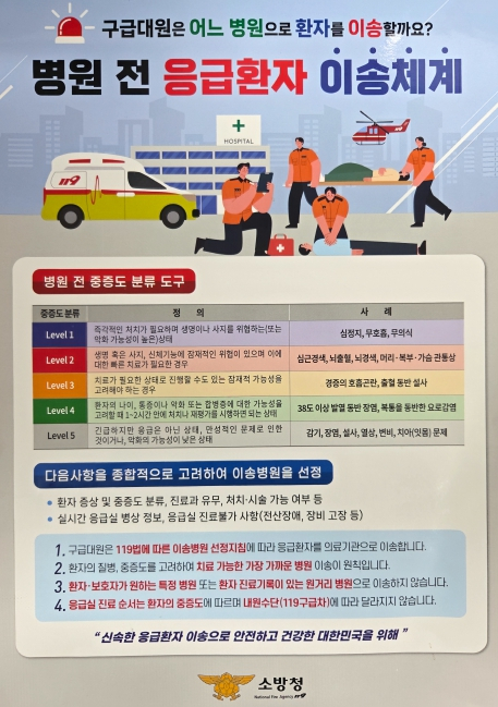 경상북도 소방본부는 도민의 생명을 더 안전하게 지키기 위해 환자의 증상에 따른‘중증도 분류(Triage)’를 기반으로 한 이송병원 선정 체계를 본격 시행하고, 이에 대한 도민 홍보와 언론 안내를 강화한다고 밝혔다.과거에는 환자나 보호자의 요청, 또는 관행에 따라 병원을 선택해 이송하는 경우가 많았지만, 경북소방본부는 이제 환자의 증상과 상태를 바탕으로 중증도를 분류하고, 그에 따라 가장 적절한 병원으로 이송하는 체계적인 시스템을 운영하고 있다.현장에서 구급대원은 환자의 증상, 의식 수준, 활력 징후 등을 종합적으로 평가해 중증도를 판단하고, 지역 의료기관의 진료 역량과 가용 정보를 함께 고려해 중증 환자는 권역·지역응급의료센터로, 경증 환자는 신속한 진료가 가능한 병원으로 이송함으로써, 의료자원의 효율적 분배와 현장 대응력 향상을 동시에 도모하고 있다.또한, 해당 병원의 응급실 수용 가능 여부나 진료 여건, 예를 들어 응급실 과밀, 전산장애, 장비 이상 등의 상황도 함께 고려해 환자 이송의 효율성과 안정성을 높이고 있다.이와 함께, 환자나 보호자가 특정 병원을 요청하더라도, 해당 병원이 진료가 불가능하거나 진료과가 없는 경우에는 다른 적절한 병원으로 이송될 수 있다. 아울러, 응급실에 도착한 이후의 진료 순서는 병원 의료진이 중증도에 따라 판단하여 결정하기 때문에, 119구급차를 이용하여 응급실을 내원 하더라도, 실제 진료 순서는 환자 상태에 따라 달라질 수 있다.박성열 경북소방본부은 “환자에게 가장 빠르고 정확한 치료가 이뤄지도록 하기 위한 결정인 만큼, 현장 구급대원의 설명에 귀 기울여 주시고 적극적으로 협조해 주시길 바란다”고 전했다.