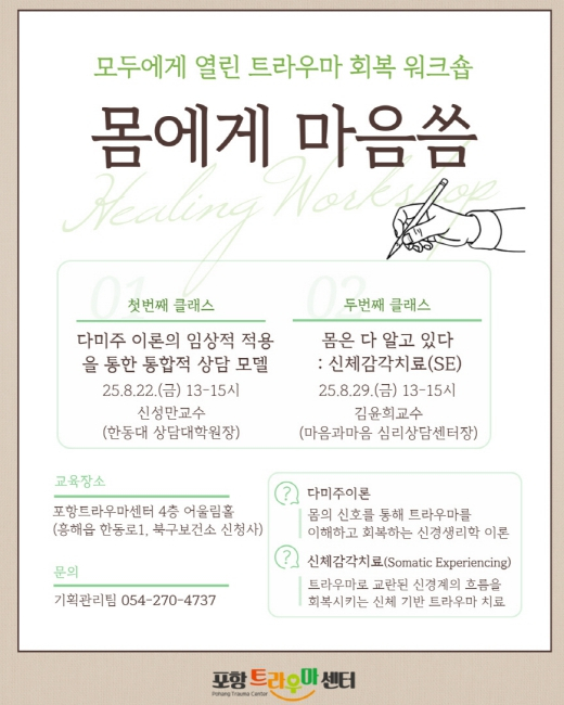 포항시 북구보건소 포항트라우마센터는 재난 상황에 대한 공동체 회복력을 높이기 위해 ‘트라우마 회복 워크숍-몸에게 마음씀’을 오는 22일과 29일 두 차례에 걸쳐 운영한다. 올해 초 신축 이전과 함께 새롭게 기획된 이번 워크숍은 회차별 40명의 유관기관 종사자와 지역 주민을 대상으로 몸을 기반으로 한 트라우마 치료 교육이 진행된다. 강연에는 한동대학교 상담대학원장이자 한국중독상담학회 회장인 신성만 교수와 한동대학교 상담대학원 교수이자 신체감각기반 치료 전문가인 김윤희 교수가 참여한다. 22일에는 ‘다미주 이론의 임상적 적용을 통한 통합적 상담 모델’, 29일에는 ‘신체 감각 기반 트라우마 치료(SE)’를 주제로 강연이 열린다. 함인석 북구보건소장은 “이번 워크숍이 트라우마 상황에서 나타나는 신체 반응을 이해하고, 증상을 겪는 주민과 이를 돕는 종사자 모두가 몸과 마음의 회복에 한 걸음 더 다가가는 계기가 되길 바란다”고 말했다. 한편 포항트라우마센터는 트라우마를 겪는 시민들을 위해 심리상담, 치유장비 체험, 신체이완 프로그램, 집단 프로그램 등 다양한 서비스를 제공하고 있으며, 자세한 사항은 센터 또는 홈페이지에서 확인할 수 있다.