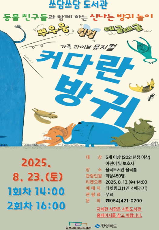 김천시립 율곡도서관은 오는 8월 23일 토요일, 율곡홀에서 강경수 작가의 동명의 그림책을 원작으로 한 가족 뮤지컬 `커다란 방귀`를 개최한다고 밝혔다. 이번 공연은 어린이들에게 널리 사랑받는 그림책 `커다란 방귀`를 각색하여 무대 위에 생동감 있게 옮긴 작품이다. 유쾌하고 따뜻한 이야기와 신나는 노래, 역동적인 퍼포먼스가 어우러져 온 가족이 공연을 함께 관람하며 웃음과 감동을 나누는 특별한 문화 체험의 장이 될 것으로 기대된다. 공연은 경상북도 저출생대응정책과에서 실시한 ‘2025년 저출생 대응 맞춤형 공모사업(결혼·출산·보육)’에 율곡도서관이 최종 선정되어 운영되는 것으로, 가족 뮤지컬 `커다란 방귀`는 ‘쓰담쓰담 도서관’ 프로그램의 첫 번째 공연이다. ‘쓰담쓰담 도서관’은 가족 맞춤형 공연 및 프로그램을 통해 도서관에서 다채로운 예술·문화·체험 활동을 할 수 있도록 마련됐으며, 율곡도서관은 8월부터 11월까지 총 6번의 다양한 공연과 체험, 탐방 등을 순차적으로 선보일 예정이다. 예매는 8월 13일 오후 2시부터 티켓링크를 통해 진행되며, 1인당 4매까지 예매할 수 있고 관람료는 무료다. 자세한 사항은 시립도서관 누리집을 참고하거나 율곡도서관 사무실로 문의하면 된다. 이신기 김천시립도서관장은 “가족이 함께 즐길 수 있는 이번 공연과 앞으로 이어질 다양한 프로그램을 통해 시민들이 문화예술과 독서의 즐거움을 만끽하고, 도서관이 가족들의 따뜻한 문화 보듬의 공간으로 자리매김하기를 바란다.”라고 전했다.