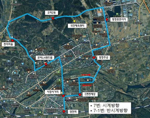 영천시는 이달 1일 개관한 국민체육센터의 접근성을 높이기 위해, 12일부터 7번 및 7-1번 시내버스 노선을 신설해 운행할 예정이라고 밝혔다.이번 노선 신설은 시민들이 국민체육센터를 보다 편리하게 이용할 수 있도록 하기 위한 조치로, 7번 노선은 시장사거리를 기준으로 시계방향, 7-1번 노선은 반시계방향으로 운행된다.7번 노선은 영천역(기점)–시장사거리–문외LH센트럴–한의마을–오미2동–국민체육센터–망정휴먼시아–망정주공-e편한세상–시장사거리–영천역(종점)을 경유하며, 도심 주요 주거지역과 국민체육센터를 연결한다.운행 시간은 영천역에서 오전 6시 30분 7-1번 첫차를 시작으로, 오후 8시 10분 7번 막차까지이며, 두 노선 각각 하루 6회씩 운행될 예정이다.한편, 지난해부터 운행돼 온 중앙1번 노선은 7번, 7-1번 노선과 중복됨에 따라 폐지될 예정이다.최기문 영천시장은 “국민체육센터 개관과 더불어 새롭게 신설되는 7번, 7-1번 시내버스 노선으로 시민들이 더욱 편리하게 최고의 체육시설을 이용할 수 있게 되어 매우 뜻깊다”며, “앞으로도 시민 중심의 교통 정책을 꾸준히 추진해 나가겠다”고 밝혔다.