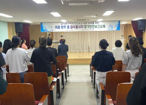 경상북도울진교육지원청은 8월 8일 한국원자력마이스터고등학교 전기제어실습동 세미나실에서 관내 초·중·고등학교 조리사, 조리원 60여 명을 대상으로‘2025년 여름방학 중 급식종사자 정기안전보건교육’을 실시했다.이번 교육은 학교 급식 종사자들이 조리 업무를 수행하는 과정 중 발생할 수 있는 산업재해에 대하여 대응 방법을 배우고, 급식 현장의 자율적인 안전문화를 형성하기 위하여 진행됐다. 교육 내용으로는 ▲자살 예방 교육, ▲산업재해보험 관련 교육, ▲급식종사자 안전보건교육으로 구성됐으며, 각 교육은 분야별 전문 강사들을 초빙해 보다 전문적이고 체계적인 교육으로 진행됐다.이기협 교육장은 “학생들에게 좋은 급식을 제공하기 위해서 급식 종사자분들의 안전한 근무 환경이 무엇보다 중요하며, 앞으로도 학교 급식 현장의 안전한 근무 환경 조성을 위해 더욱 노력하겠다.”고 말했다.