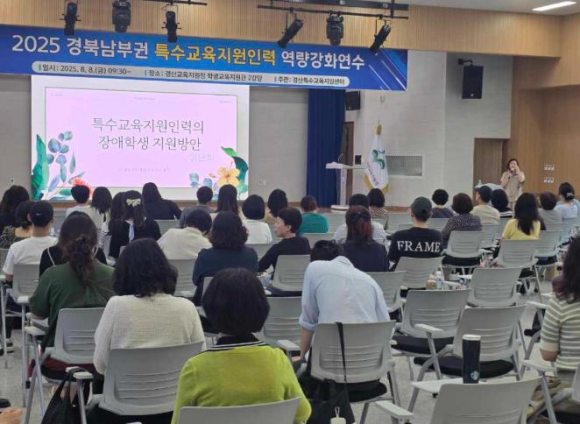 경산교육지원청 특수교육지원센터는 8월 8일 학생교육지원관 2강당에서 경북 남부권(경산, 영천, 경주, 청도) 유, 초, 중, 고등학교 및 특수학교의 특수교육실무사 94명 및 사회복무요원 10명을 대상으로 ‘특수교육지원인력 역량 강화 연수’를 실시했다. 이날 연수는 특수교육지원인력이 현장에서 겪는 어려움 및 효율적 지원 방안에 대해 소통하는 시간을 가졌고, 학생과 지원인력 모두가 행복한 교실을 위한 지원의 실제에 대해 다양한 사례 중심으로 안내했다. 또한, 지원인력의 교육회복 지원을 위한 향수와 석고방향제 만들기 힐링 체험으로 구성했다. 경산교육지원청은 거점 특수교육지원센터로 장애학생의 교육권 확보를 위하여 방학 기간에 지원인력 연수를 실시하고 있다. 박혜옥(교육지원과장) 센터장은 “특수교육대상학생의 행복한 학교생활을 위해 현장에서 지원하느라 애써주시는 특수교육실무사와 사회복무요원의 노고에 감사한 마음을 전한다.”,“앞으로도 지속적인 소통과 역량강화 연수를 통해 특수교육대상학생 지원에 도움이 되도록 노력하겠다.”고 말했다.