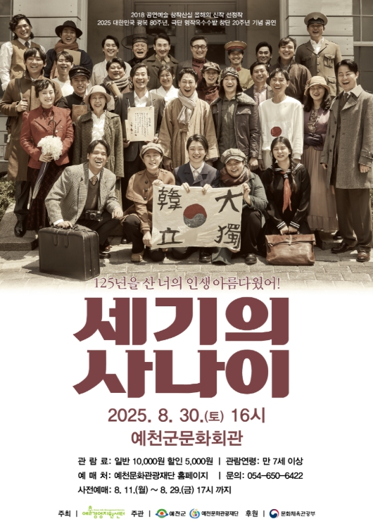 예천군과 (재)예천문화관광재단은 이달 30일 오후 4시, 예천군문화회관에서 광복 80주년 특별 기획공연 ‘세기의 사나이’를 선보인다. 2025 공연예술 지역 유통 지원 공모사업에 선정되어 진행하는 광복 80주년 기념 특별 기획공연 ‘세기의 사나이’는 3.1운동, 비바이 탄광 매몰 사건, 한국전쟁 등 역사적 사건들의 사실적 재현보다 한 인간의 삶을 통해 한국 근현대사의 아픈 역사를 다룬 작품이다. 기존의 연극과 달리 만화적 상상력과 탄탄한 서사를 결합해 지금껏 보지 못한 새로운 무대 양식을 선보이며, 무려 31명의 배우들의 생생한 연기와 정교하게 어우러지는 생동감 넘치는 시각적 연출은 마치 한편의 웹툰을 눈앞에서 넘겨보는 듯한 경험을 선사해 줄 작품이다. 특히, 이번 공연은 광복 80주년을 맞이하는 공연으로 역사적인 사실 속에서 주목받지 못했지만, 역사속에서 대한민국을 위해 힘썼던 평범한 사람들을 주목하는데 의미가 있는 작품이다. 공연은 일반 관람권은 10,000원, 아동·청소년·65세 이상은 할인권 5,000원에 구매할 수 있다. 국가유공자와 중증 장애인은 무료로 관람 가능하며 예매는 11일 부터 예천문화관광재단 홈페이지와 예천군문화회관에서 동시 진행된다. 자세한 사항은 (재)예천문화관광재단 홈페이지또는 예천군문화회관 공연기획 담당자로 문의하면 된다. 김학동 이사장은 “이번 ‘세기의 사나이’ 공연은 광복 80주년을 기념한 특별공연으로 이를 통해 광복을 위해 노력하신 독립 유공자와 그 후손들, 그리고 그 뜻을 이어받아 오늘의 대한민국을 지켜내고 있는 모두가 국가의 주인임을 되새기는 기회가 됐으면 한다”고 밝혔다.