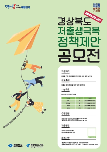 경상북도가 체감도 높은 저출생 극복 정책 발굴을 위해 11일부터 24일까지 ‘저출생 극복 정책 제안 공모전’을 개최한다.공모전은 ‘여러분의 제안(아이디어)을 채택(캐스팅)합니다.’라는 구호로 진행되며, 경북도민이라면 누구나 저출생 극복을 위한 정책을 제안할 수 있다. 경상북도 또는 경북테크노파크 누리집 공고 내 정보무늬(QR코드)를 통해 제안하면 된다.우수 정책 제안으로 선정된 대상자에게는 대상 50만 원을 포함해 총상금 300만 원 규모의 전통시장 상품권이 지급될 예정이다. 우수 제안은 정책 검토를 통해 시범 사업으로 추진 하는 등 도민의 목소리가 경북도의 정책으로 이어질 수 있도록 할 계획이다.한편, 경북도는 저출생 극복을 위해 학계, 돌봄 종사자, 지역 청년 등과 소통하고, ▴저출생 정책평가센터 ▴저출생 전문가 실무단 ▴도민 모니터링단 등을 운영해 사업 성과와 정책 수요자 반응 등을 점검하고 있다.엄태현 저출생과 전쟁본부장은 “이번 공모전을 통해 수요자 관점에서 바라본 저출생 극복 정책은 무엇인지 다시 한번 되돌아보는 기회로 삼겠다.”라며, “도민들이 주신 제안에 대해서는 하나하나 읽어보고 정책에 반영해 저출생 극복을 위한 동력으로 이어가겠다”라고 밝혔다.