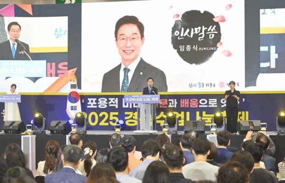 경북교육청은 9일 구미시에 있는 구미코(GUMICO)에서 교원과 학생․교육전문직원 등 1,500여 명이 참여한 가운데 ‘2025 경북수업나눔축제’를 성황리에 개최했다고 밝혔다.올해로 8회째를 맞은 ‘경북수업나눔축제’는 2018년 시작 이래 교원들이 수업의 가치를 나누고 배우는 경북의 대표적인 교육 축제로 자리 잡았다.‘포용적 미래! 질문과 배움으로 잇다’를 주제로 열린 이번 축제는 학생 중심의 수업 문화 확산과 미래 역량 중심 교육의 방향을 함께 고민하는 의미 있는 장이 됐다.특히, 올해는 처음으로 ‘초‧중등 질문축제’와 ‘수업나눔축제’를 통합 운영해 교사 중심을 넘어 학생이 질문의 주체가 되는 장으로 확장됐다. 초등학생은 ‘아하! 경북 사제동행 질문대축제’에서 탐구 질문을 제시하고, 고등학생은 ‘궁리한마당’ 활동을 통해 현실에서 경험한 문제를 스스로 분석하고 창의적으로 해결 방안을 제시했다. 이는 학생들이 미래교육의 주체로 적극 성장하는 계기를 마련했으며, 교사와 교육전문직원의 실천적인 조언 또한 어우러져 현장성 있는 배움이 이루어졌다.메인 행사장에서는 최신 교육의 동향과 깊이 있는 학습의 의미를 조망하는 초청 강연이 이어졌다. 국내 교육학 분야의 권위자인 이화여자대학교 옥현진 교수는 ‘학생 질문 생성에 기반한 깊이 있는 학습’을 주제로, 질문 중심 수업의 실제 사례와 필요성을 생생히 전달했다.또한, 한양대학교 조병영 교수는 ‘문해력과 미래교육’을 통해 급변하는 디지털 사회에서 학생들의 문해력과 창의력, 그리고 질문하는 힘이 미래 사회에서 얼마나 중요한지에 대해 강연하면서, 참석자들로부터 깊은 공감을 끌어냈다.이날 축제에서는 유․초․중․고 등 32개의 수업 나눔 부스도 운영됐다. 수업 나눔 부스는 단순한 전시가 아닌, 실제 수업 현장에서 활용할 수 있는 아이디어와 교수학습 방법을 공유하는 실천의 장으로, 교사와 교사 간의 배움과 성장이 일어나는 축제의 핵심 공간이다. 올해 운영된 수업 나눔 부스는 초․중등 교과 중심의 수업 시연, 학생 참여형 수업 디자인, 인공지능(AI)을 활용한 디지털 수업, 문해력 향상 전략, 경북교육 주요 정책(질문, IB, 정주학교 등) 등 다양한 주제를 중심으로 구성됐으며, 교사들은 직접 수업을 시연하거나, 수업 자료를 전시하고 참가자들과 자유롭게 소통하며 수업 전문성을 높이는 시간을 가졌다.그리고 수업 나눔 교실에서는 수업 나눔 교사들이 참관자들과 실시간 질의응답을 나누며, 수업에 대한 다양한 관점과 해석을 공유하는 장이 마련됐다. 이는 질문과 배움을 통해 서로 잇고, 성장하는 수업 문화로 나아가는 데 중요한 계기가 됐다. 특히, 도내 교원뿐 아니라 타 시도 교사들도 수업 시연에 참여하여 질문 기반 다양한 수업 전략에 대한 깊이 있는 피드백과 토론이 이루어졌다. 이를 통해 지역 간, 학교 간 우수 수업 콘텐츠가 공유되어 수업 전문성 제고에 크게 이바지했다.현장에 참석하지 못한 교원․학생․학부모를 위해 모든 일정은 경북교육청 공식 유튜브 채널 ‘맛쿨멋쿨TV’로 실시간 중계돼, 누구나 장소 제약 없이 참여할 수 있는 열린 축제로 거듭났다.임종식 교육감은 “2025 경북수업나눔축제는 교실 속 변화를 뛰어넘어, 교사와 학생이 함께 주도적으로 만들어내는 미래 교육의 희망을 확인한 뜻깊은 자리였다”라며, “앞으로도 모두를 위한 따뜻한 배움의 길을 함께 열어나가겠다”라고 밝혔다.