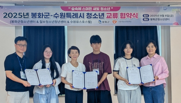 봉화군 청소년센터는 지난 8일 우호 도시인 수원시와의 교류 활성화의 일원으로 수원시 청소년 기관과 업무협약(MOU)식을 가졌다고 밝혔다.이번 업무협약(MOU)은 수원시 칠보청소년청년센터, 수원유스호스텔과 청소년교류 활성화 및 지속적인 협력기반 마련을 위한 우호협력을 약속한 자리였다.양 도시 청소년센터 청소년운영위원회 청소년, 관계자 등 총 50여 명이 참여한 이날 행사는 봉화군청소년센터와 국립청소년 미래환경센터에서 1박 2일 일정으로 진행됐다. △청소년활동활성화 협약식 △양 기관 소개 및 교류활동 △봉화군 문화탐방 △국립청소년미래환경센터 탐방 △아이스브레이킹 및 팀빌딩활동 △국립백두대간수목원 견학 및 체험활동 등이 진행됐다.김은찬(봉화고 1학년) 봉화군청소년운영위원장은 “수원 친구들과 교류하면서 청소년 운영위원회활동이 단순한 프로그램이 아니라 지역과 지역을 연결하는 중요한 역할을 할 수 있다는 것을 느꼈다.”라고 말했다.김경숙 교육가족과장은 “청소년 교류를 통해 양 도시 간 우호가 더욱 깊어졌다.”면서 “앞으로도 다양한 체험중심의 연계프로그램을 통해 청소년의 역량이 실질적으로 성장할 수 있도록 더욱 노력하겠다.”라고 강조했다.