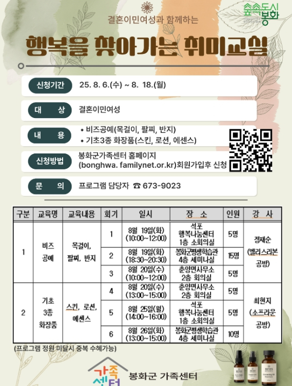 봉화군가족센터는 8월 19일부터 26일까지 결혼이민여성 35명을 대상으로 ‘행복을 찾아가는 취미교실 체험활동’ 프로그램을 진행한다.이번 체험 프로그램은 총 6회기 과정으로 석포 행복나눔센터 1층 소회의실, 춘양면사무소 2층 회의실, 봉화군평생학습관 4층 세미나실에서 진행된다. 프로그램은 비즈공예 3종, 기초 화장품 만들기 3종으로 구성되며, 전 과정이 실습 중심으로 진행되어 참여자들의 흥미와 만족도를 높일 것으로 기대된다.이번 프로그램은 다문화가족 초기 정착지원 사업의 일환으로 원거리 지역에 거주하는 결혼이민여성에게 참여 기회를 확대하고, 자기개발 및 지역사회와의 소통을 통해 초기 적응과 안정적인 정착에 실질적인 도움을 주기 위해 마련됐다.참여 신청은 지역별로 구분하여 모집되며, 오는 18일까지 봉화군가족센터 누리집을 통해 신청할 수 있다.김경숙 봉화군가족센터장은 “이번 취미교실 프로그램을 통해 원거리 결혼이민여성들에게 다양한 체험 기회를 제공하고, 공통의 관심사를 통해 구성원 간 유대감을 형성하는 계기가 되기를 바란다.”라고 전했다.