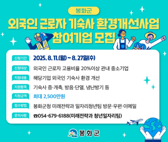 봉화군은 봉화군 내 외국인 근로자의 정주 여건 개선과 복지 향상을 위한 ‘외국인 근로자 기숙사 환경개선 시범사업’을 추진하고, 오는 8월 27일까지 사업에 참여할 기업을 공개 모집한다고 밝혔다.이번 사업은 외국인 근로자를 고용 중인 봉화군 관내 중소기업 중 고용 비율이 20% 이상인 기업을 대상으로 하며, 기숙사 환경 개선을 위한 비용의 50% 이내, 최대 2,500만 원까지 지원된다. 지원 항목에는 기숙사 증·개축, 방음·단열 공사, 위생 및 안전 시설 보강, 냉난방기 설치, 휴게공간 조성등이 포함된다.해당 사업은 경상북도 보조사업으로, 경북도와 봉화군이 비용의 50%를 지원하며 신청 기간은 8월 11일부터 27일까지이다. 신청은 봉화군청 미래전략과 일자리청년팀으로 방문, 우편, 이메일로 접수할 수 있다.봉화군 관계자는 “이번 사업을 통해 외국인 근로자의 근로 및 주거환경을 실질적으로 개선되어 기업의 인력 안정성과 지역 정주여건 개선에 기여할 것으로 기대된다.”며 “관심 있는 중소기업의 많은 신청을 바란다.”라고 전했다.