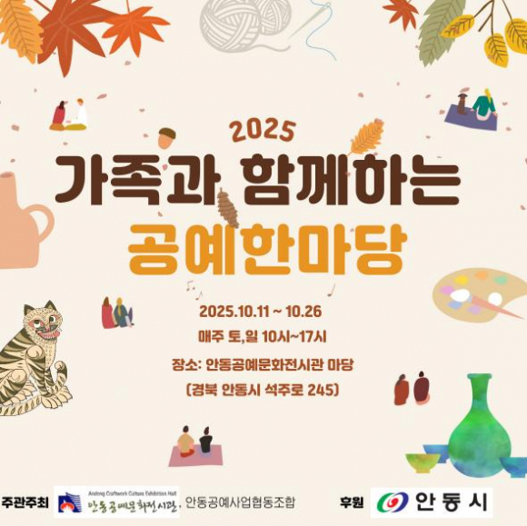 안동공예문화전시관(안동공예사업협동조합)이 주최하고 안동시가 후원하는 ‘2025 공예한마당’ 행사준비가 한창이다. 이번 행사는 공예품의 아름다움을 전달하고 안동 시민들에게 가까운 거리에서 작품을 마주하며 공예에 대한 친근한 경험을 제공하는 목적으로 기획됐다. 행사는 10월 11일부터 26일까지 매주 주말마다 안동공예문화전시관 앞마당(안동시 석주로 245)에서 진행되며, 어린이들(초등6학년생까지)이 가족과 함께하는 금속공예, 목공예, 섬유공예, 한지공예, 도자기공예 분야의 공예작품 만들기 경연대회에 참여하여 솜씨를 뽐내고 매주 색다른 분야의 작품에 도전 하여 수상의 영광을 얻을 기회를 제공한다.‘2025 공예한마당’은 예술과 문화를 경험하고 나만의 작품을 만들며 소중한 시간을 보내고자 하는 이들에게 꼭 필요한 문화적인 행사로 자리매김하고 있다. 참여자들은 직접 손으로 작품을 만들어보며 공예의 창조적인 과정과 즐거움을 체감할 수 있다. 체험은 무료체험이며, 안동공예작가들의 다양하고 퀼리티 높은 체험을 현장에서 동일하게 경험할 수 있어, 시민들로부터 많은 관심과 참여가 기대된다.