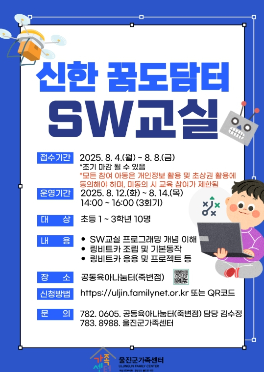 울진군은 울진군가족센터 내 운영되고 있는 공동육아나눔터 울진점과 죽변점에서 관내 초등학생 20명을 대상으로 8월 12일부터 14일까지 3일간 ‘SW교실’ 프로그램을 운영한다. 이번 프로그램은 신한금융 희망재단과 여성가족부가 함께하는 ‘신한 꿈도담터 SW교실’의 일환으로, 디지털 시대를 살아갈 아동들이 코딩 기초를 쉽고 재미있게 체험하며 논리적 사고력과 문제해결 능력을 키울 수 있도록 마련됐다. 수업은 블록 코딩, 미니게임 제작, 간단한 로봇 제어 등 실습 중심으로 진행되며, 참여 학생들은 직접 아이디어를 구현하고 또래와 협력하여 자기 표현력과 협업 능력을 기를 수 있는 계기가 될 것으로 기대된다. 공동육아나눔터는 울진군가족센터가 운영하는 가족지원 거점 공간으로, 놀이·교육·돌봄이 결합된 다양한 체험형 프로그램을 정기적으로 제공하고 있으며, 문의는 울진점 또는 죽변점으로 하면 된다. 손병복 울진군수는 “아이들이 디지털 기술을 단순 활용하는 데 그치지 않고, 스스로 만들고 문제를 해결하는 주체로 성장하는 것이 중요하다”며 “앞으로도 가족과 아동이 함께 성장할 수 있는 다양한 체험형 프로그램을 통해 울진군민의 삶의 질 향상에 기여하겠다”라고 말했다.