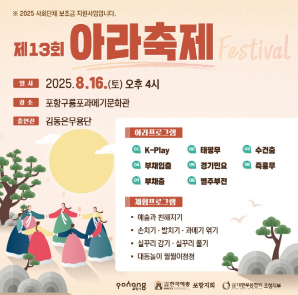 포항구룡포과메기문화관은 오는 16일 오후 4시 ‘제13회 아라축제’ 전통무용공연을 개최한다. 올해 공연에는 지역을 대표하는 김동은무용단이 무대에 올라 태평무, 수건춤, 부채입춤, 경기민요, 별주부전 등 전통과 창작이 어우러진 다채로운 작품을 선보이며 관객들에게 흥과 멋을 전할 예정이다. 무용공연과 함께 온 가족이 즐길 수 있는 체험 프로그램도 마련됐다. ‘예술과 친해지기’, ‘손치기·발치기·과메기 엮기’, ‘실꾸리 감기·풀기’, ‘대동놀이 월월이청청’ 등 전통놀이와 창의체험 활동이 준비돼 있어, 관람객이 단순히 보는 것을 넘어 출연진과 함께 어울리며 직접 체험하는 시간을 가질 수 있다. 김창식 수산물품질관리센터장은 “아라축제는 전통과 현대가 어우러지는 지역 대표 복합문화행사”라며 “과메기문화관을 찾는 시민과 관광객 모두가 우리 문화의 매력과 흥겨움을 느끼고, 올여름 잊지 못할 추억을 만들어 가시길 바란다”고 말했다.