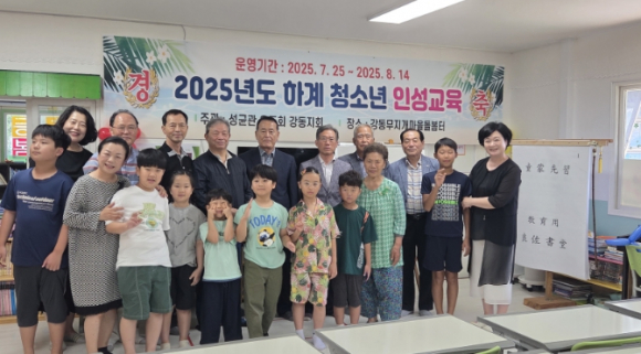 성균관유도회 경주지부 강동지회(회장 이종백)는 지난 14일 강동무지개마을돌봄터에서 학생 20여명과 함께 2025년도 하계 청소년 인성교육 수료식을 가졌다.이날 수료식에는 이종암(경주향교 전교), 백수청(성균관유도회 경주지부 회장), 정문탁(성균관유도회 경주지부 부회장), 이중희(성균관유도회 경주지부 사무과장), 이종백(성균관유도회 경주지부 강동지회장), 이두원(성균관유도회 경주지부 강동지회 부회장), 김영주(성균관유도회 경주지부 강동지회 총무), 김성남(강동면장) 등이 참석해 수강생들을 격려하고 수료를 축하했다.이번 인성교육은 여름방학을 이용해 7월 25일부터 3주간 평일 오전 2시간씩 진행됐다. 지역 유림의 덕망 높은 이두원 강동지회 부회장이 강의를 맡아 평소 접하지 못하는 동몽선습, 예절, 한자부수 등을 교육해 학부모와 청소년들로부터 큰 호응을 얻었다. 이종백 강동지회장은 “요즘 청소년은 한자를 접할 기회가 적은데, 단순히 한자를 달달 외우는 것이 아니라 교육을 통해 즐겁게 배우는 모습을 보며 보람을 느낀다. 앞으로도 지역에 있는 청소년들이 인(仁)·의(義)·예(禮)·지(智) 등 기본적인 덕목을 쉽게 배우고 이해할 수 있도록 노력하겠다”라고 말했다. 김성남 강동면장은 “무더위가 기승을 부리는 가운데 학생들의 올바른 가치관과 사회성을 기르기 위해 교육의 장을 열어주신 성균관유도회 관계자분들께 감사의 말씀을 드린다”라면서, “비록 짧은 기간이지만 좋은 배움의 기회였기를 바라며 이번 배움을 바탕으로 지역사회에서 필요로 하는 인재로 성장해 주기 바란다”라고 말했다.