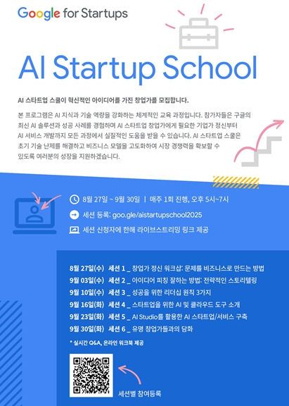 경상북도는 국제적 테크기업 구글(Google)과 함께 지역 내 인공지능(AI) 분야 기업인·창업가를 비롯한 창업을 준비하는 지역민을 대상으로 실전 창업 교육 프로그램인 ‘AI 스타트업 스쿨(AI Startup School)’을 8월 27일부터 9월 30일까지 총 6주간 운영한다.실시간 온라인 형식의 이번 교육은 매주 1회씩 2시간(오후 5시~7시) 동안 진행되며, 참가자는 구글의 최신 인공지능(AI) 솔루션과 실제 창업 사례를 바탕으로, 기술 역량과 비즈니스 마인드를 동시에 키울 수 있는 체계적인 프로그램을 이수하게 된다.또, 실시간 Q·A와 온라인 워크북도 함께 제공해, 참가자들의 학습 효과를 극대화할 수 있도록 지원할 계획이다.창업가 정신과 문제 해결 중심의 비즈니스 마인드 함양, 아이디어를 효과적으로 전달하는 IR피칭과 스토리텔링 전략, 리더십 원칙과 조직 강화 등 창업가의 내부 역량 강화를 시작으로, AI 및 클라우드 도구의 실전 활용법, 구글 AI 스튜디오를 활용한 서비스 구축 방법, 성공한 창업가들과의 대화 세션까지, 기초부터 실전 응용까지 아우르는 탄탄한 교육과정이 기다리고 있다.참가 신청은 AI 스타트업에 관심 있는 도민이면 누구나 가능하며,또는 포스터 내 QR코드를 통해 참가 등록을 할 수 있다. 도민의 적극적인 참여 독려를 위해, 한동대학교와의 협력으로 한동대학교 에벤에셀관에서 ‘Watch-Party`가 진행된다. 온라인으로 진행되는 교육 세션을 다른 스타트업과 함께 시청하고 교류하기 위해 마련된 오프라인 행사로, 참석자에게는 구글에서 준비한 오프라인 워크북, 선물 등이 제공된다.최혁준 경북도 메타에아이(AI)과학국장은 “AI 스타트업 스쿨은 기술과 창업이 결합한 교육 플랫폼으로, 지역의 혁신 창업 생태계를 만들어 가는 계기가 될 것이다”며 “경상북도와 구글의 파트너십이 본궤도에 오른 만큼 세계 최고 수준 기업의 역량이 지역 기업의 성장으로 연결될 수 있도록 협력을 확대해 나가겠다”고 밝혔다.한편, 경상북도는 올해 5월 구글과 전략적 파트너십을 구축하고 경주에서 개최되는 APEC 2025 KOREA의 성공적 개최를 위해 긴밀하게 협력하기로 했으며, 지역 관광 진흥부터 지역의 디지털 전환 및 도민의 인공지능 활용 능력 제고까지 다양한 영역에서 공동의 발전을 위해 노력하기로 합의한 바 있다.