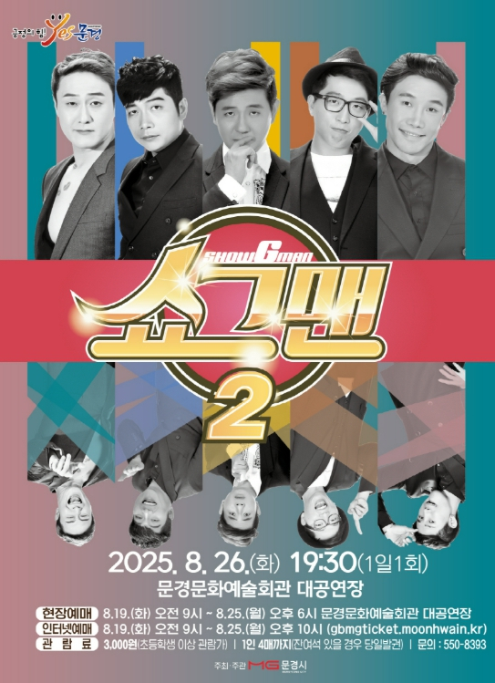 KBS 개그콘서트 출신 5명의 개그맨이 펼치는 개그쇼 ‘쇼그맨 2’ 공연이 8월 26일 화요일 19:30 (1일1회)에 문경문화예술회관 대공연장에서 열린다.이번공연은 2019년 문경공연 당시 관객에게 큰 인기를 얻었던‘쇼그맨’ 공연의 업그레이드 버전으로 개그맨 박성호, 김원효, 김재욱, 정범균, 이종훈 등이 출연한다. 개그 경력 합산 60년이 넘는 배테랑 개그맨들이 펼치는 다양한 끼와 재치 있는 입담을 볼 수 있는 코너, 방송에서 보지 못했던 새로운 개그, 가창력이 있는 수준 높은 노래, 코믹 댄스 등 화려하고 다양한 퍼포먼스가 펼쳐지며 남녀노소를 불문하고 공연 시작부터 공연이 종료될 때까지 끊임없는 웃음을 선사할 예정이다.입장권은 전석 3,000원(초등이상관람가)이며, 오는8월 19일(화) 오전 9시부터 현장예매(대공연장)와 인터넷예매가 가능하다. 자세한 사항은문경시청홈페이지`에서확인할수있다.