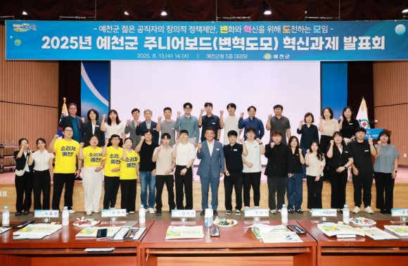 예천군은 13일 오후 2시, 군청 5층 대강당에서 ‘혁신 주니어보드 혁신과제 발표회’를 개최했다. 총 5개팀 22명의 젊은 공직자들로 구성된 4기 혁신 주니어보드는 지난 3월 워크숍을 시작으로 정기 프로그램 활동을 통해 정책과제 발굴을 위한 정책기획 역량 강화와 더불어 팀별로 발굴한 정책과제를 구체화하는 작업을 진행해왔다. 이와 더불어 ‘군수님과 함께하는 공감 소풍’, ‘두근두근, 변혁도모의 러브레터’, ‘작은 시책 이야기’를 통해 위계 없는 수평적 소통문화 정착 및 조직문화·일하는 방식 개선을 위한 혁신 활동을 펼쳤다. 이날 혁신 주니어보드는 지속적인 정책 아이디어 발굴 활동을 통해`예천 옐로우시티 도시브랜드 확립 사업`,`나랑 예천을 달려볼래?`,`살어리 살어리랏다, 예천에 살어리랏다`,`예천 새로(SERO) 정비사업`,`신뢰를 잇다, ‘잇다’`라는 다섯 가지 팀별 사업명으로 인구, 문화관광, 농업 등 다양한 분야에 걸쳐 참신하고 현실성 있는 정책 아이디어를 제안하고 평가하는 시간을 가졌다. 또한 이날 발표회는 그동안 심사위원들만 배석하던 발표회 분위기를 과감하게 전환하여 각 부서의 다양한 직원들이 ‘참석단’이라는 이름으로 함께 참여해 주니어보드의 정책 제안을 청취하고 의견을 공유하는 시간을 가졌다. 발표된 정책들은 향후 관련 부서로 공유해 각종 공모사업 대응은 물론 군정 시책 수립을 위한 실질적인 아이디어로 활용될 예정이다. 김학동 군수는 “혁신 주니어보드 단원들의 창의적이고 도전적인 정책 아이디어가 단순한 제안에 그치지 않고 군정 발전을 위해 잘 활용될 수 있기를 바라며, 앞으로도 참신하고 다양한 아이디어가 지속적으로 발굴될 수 있기를 기대한다”고 말했다.