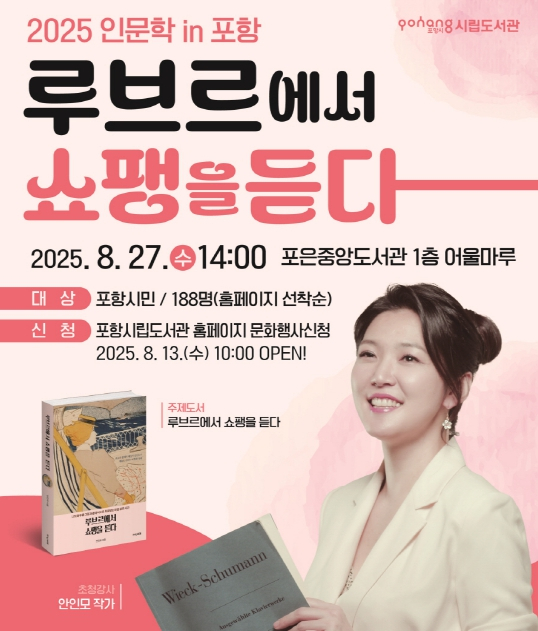 포항시립도서관은 ‘8월 문화가 있는 날’을 맞아 오는 27일 오후 2시 포은중앙도서관 1층 어울마루에서 ‘인문학 in 포항’ 여섯 번째 강연을 연다. 이번 강연에는 클래식 해설가이자 작가인 안인모 씨가 초청돼 ‘루브르에서 쇼팽을 듣다’를 주제로 그림이 들려주는 클래식 이야기를 들려줄 예정이다. ‘인문학 in 포항’은 시립도서관의 대표 프로그램으로, 매년 3월부터 10월까지 매달 마지막 주 수요일 ‘문화가 있는 날’에 각 분야 저명 인사를 초청해 진행한다. 안인모 작가는 이화여자대학교 음악대학 및 동 대학원을 졸업하고, 미국 워싱턴 D.C. 가톨릭대학교에서 박사과정을 수료했다. 이화여대와 경희대 예술디자인대학에서 겸임교수를 역임했으며, 방송 프로그램 ‘클래식이 알고싶다’ 진행과 저서 ‘클래식이 알고싶다’, ‘루브르에서 쇼팽을 듣다’ 등으로 대중과 활발히 소통하고 있다. 이번 강연은 시립도서관 홈페이지 ‘문화행사신청’ 코너에서 13일 오전 10시부터 사전 접수 받는다. 자세한 사항은 홈페이지나 포은중앙도서관으로 문의하면 된다.