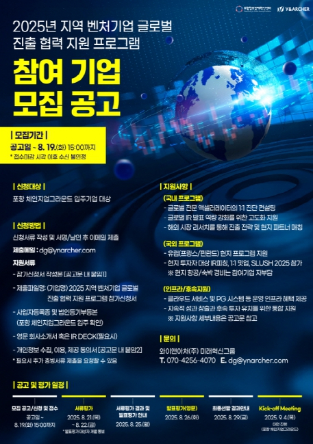 포항창조경제혁신센터는 ‘2025년 지역 벤처기업 글로벌 진출 협력 지원사업’에 참여할 기업을 오는 19일까지 모집한다고 밝혔다. 이 사업은 맞춤형 액셀러레이팅(초기 기업의 성장 지원)과 해외 네트워크 연계로 포항 유망 벤처기업의 글로벌 경쟁력을 강화하고자 올해 처음 기획됐다. 참여기업이 글로벌 시장을 직접 경험하고 사업의 역량을 확장해 향후 투자유치와 현지 진출 기회를 실질적으로 마련할 수 있도록 돕는 데 중점을 두고 있다. 기업 선정은 투자자 및 해외 벤처캐피털로 구성된 평가위원단의 서류심사와 영문 발표평가 심사로 이뤄지며, 최종 3개사를 대상으로 국내·해외·후속 지원의 3단계 프로그램이 운영된다. 먼저, 국내 프로그램에서는 기업별 진단 분석으로 자사 사업을 객관적으로 점검하고, 영문 투자유치 활동(IR 피칭) 컨설팅 및 현지투자자 대상 모의 IR 피칭 실시로 해외 진출 역량을 강화한다. 이어, 현지 컨설턴트사와 연계해 해외시장 조사를 진행하고 그 결과를 기반으로 파트너사 발굴과 해외시장 전략을 수립한다. 해외 프로그램에서는 유럽 투자자 대상 데모데이와 비즈니스 매칭을 추진해 기업들의 글로벌 투자유치와 홍보 기회를 창출하고, 현지기관 방문과 워크숍을 진행해 해외 진출 전략을 구체화할 예정이다. 특히, 매년 핀란드 헬싱키에서 열리는 북유럽 최대 창업 컨퍼런스인 ‘SLUSH 2025’에 참석해 글로벌 투자자 및 파트너사와의 교류 기회를 확대하고 실질적인 사업 협력과 투자 연계로 이어지도록 할 계획이다. 센터는 이번 사업으로 포항의 유망 벤처기업들이 글로벌 시장에 진출할 수 있는 실질적 기반을 마련하고, 나아가 지역 경제 발전과 미래 성장 동력 확보에도 기여할 것으로 기대하고 있다. 김정표 일자리경제국장은 “이번 사업은 기업 진단부터 해외 진출, 후속 관리까지 전 과정을 아우르는 전략적 프로그램”이라며 “국내 벤처기업들이 해외시장에서 경쟁력을 갖출 수 있도록 지속적으로 지원하겠다”고 밝혔다. 자세한 내용은 포항창조경제혁신센터 홈페이지에서 확인할 수 있으며, 문의는 와이앤아처(주) 미래혁신그룹으로 하면 된다.