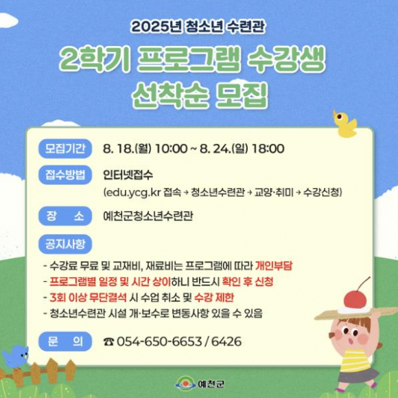 예천군은 지역 청소년들의 건강한 성장과 다양한 경험을 지원하기 위해 청소년수련관 2학기 프로그램 수강생을 모집한다.이번 프로그램은 한국사, 음악, 코딩, 스포츠, 과학 등 총 11개 프로그램에서 166명의 수강생을 모집하며 청소년들의 흥미와 관심을 반영한 다양한 활동으로 구성됐다.수강신청 기간은 이달 18일 10시부터 24일 18시까지며 예천군 통합교육포털을 통해 선착순으로 접수한다. 프로그램에 대한 상세 내용이나 기타 문의는 예천군청소년수련관으로 연락하면 된다.윤선희 주민행복과장은 “다가오는 2학기를 맞아 청소년들이 필요로 하는 교육과 활동을 최우선으로 고려하여 다양한 프로그램을 준비했다”며, “각 프로그램의 일정과 시간이 다르니 희망하는 분야를 꼼꼼히 확인하여 많은 관심과 참여를 바란다”고 전했다.