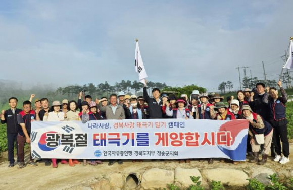 한국자유총연맹 청송군지회는 제80주년 광복절을 맞아 나라사랑 정신을 고취하고 애국심을 함양하기 위해 14일 ‘태극기 달기 캠페인’을 실시했다.이번 캠페인에는 청송군지회 읍·면 임원들이 참여해 광복절 태극기 게양을 권장하며 홍보 전단지를 배부했다. 회원들은 각 읍·면 상가를 직접 방문해 태극기를 전달하고, 군민들에게 태극기 달기 동참을 당부했다.박경순 회장은 “태극기는 우리 민족의 자긍심이자 국가의 상징”이라며, “이번 캠페인을 통해 애국심을 되새기고 군민 모두가 태극기 달기에 적극 참여해 주시길 바란다.”라고 말했다.윤경희 청송군수는 “태극기 달기 캠페인에 동참해 주신 한국자유총연맹 청송군지회와 군민 여러분께 감사드린다.”며, “광복절의 의미를 되새기고, 태극기 게양을 통해 선열들의 숭고한 희생정신을 기릴 수 있기를 바란다.”라고 전했다.
