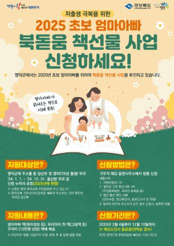 영덕군은 경상북도와 함께 ‘저출생과 전쟁 100대 실행 과제’의 일환으로 ‘2025년 초보 엄마 아빠 북돋움 책 선물 사업’을 시행한다.이번 사업은 육아 정보 부족으로 인한 부담을 덜고 아이의 독서 습관 형성 기반을 마련하기 위해 초보 엄마 아빠에게 출산과 육아에 대한 정보를 담은 책 4권과 우리 아이 첫 그림책 3권으로 구성된 약 10만 원 상당의 도서 꾸러미를 제공하게 된다.지원 대상은 영덕군에 주소를 둔 임신부, 영아(2025년 출생) 부모, 24년 출산한 부모 중 신청 누락자이며, 관내 거주하는 외국인 부모도 포함된다.신청은 신분증과 등본을 지참하고 거주지 읍·면사무소를 방문해 신청서와 임신 혹은 출산을 증명할 수 있는 구비서류(산모수첩, 임신확인서, 출생증명서, 가족관계증명서 등 택일)를 제출하면 되며, 예산 소진 시 조기 마감된다.도서 꾸러미 발송은 매월 10일 신청자 확정 후 월말 전 일괄 진행될 예정이며, 기타 자세한 사항은 영덕군청 누리집을 참고하거나 문화관광과 문화예술팀으로 문의하면 된다.