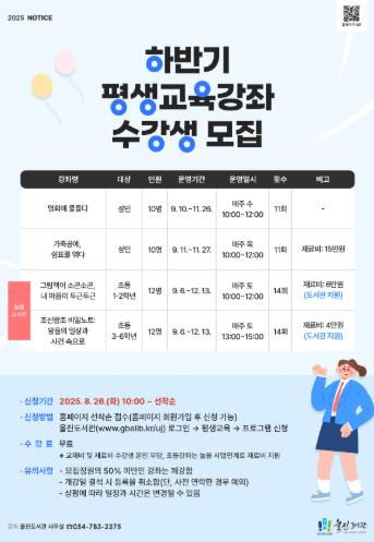경상북도교육청 울진도서관은 오는 9월부터 12월까지 ‘하반기 평생교육강좌 및 늘봄도서관’을 운영한다. 성인을 대상으로 명화의 깊이있는 감상과 해석이 있는 `명화에 물들다`, 천연가죽을 이용한 실생활 소품 만들기 `가죽공예, 쉼표를 엮다` 2개 강좌를 진행할 예정이다. 초등강좌의 경우 늘봄학교 사업과 연계하여 그림책 및 역사 강좌를 마련했다. 초등1~2학년을 대상으로 `그림책이 소곤소곤, 내 마음이 두근두근`, 초등3~6학년을 대상으로 `조선왕조 비밀노트: 왕들의 일상과 사건 속으로`을 운영할 예정이다. 수강신청은 오는 8월 26일 오전 10시부터 도서관 누리집을 통해 선착순으로 접수가 가능하며, 기타 자세한 사항은 사무실로 문의하면 된다.