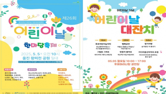 울진군은 5월 5일 제103회 어린이날을 맞이하여 왕피천공원 일대와 후포 마리나항 일대에서 미래의 주역인 어린이를 위한 한마당 축제를 개최한다.왕피천공원 일대에서는 울진청년회의소 주관으로 ‘제26회 어린이날 한마당 축제’가 10시부터 16시까지 공연 및 다양한 체험 마당이 펼쳐진다. 왕피천공원 주공연장에서 청소년 오케스트라, 태권도 공연을 시작으로 모범 어린이 29명 표창 수여와 함께 꿈과 희망의 나비 날리기 행사 및 마술쇼, 인형극 등이 펼쳐진다.또한 개회식 후 주공연장 주변에 에어바운스, 키링 만들기, 버섯수확 체험, 목공예 체험, 도예아트, 드로잉 그림그리기, 격파, 정크아트, 천연 염색 체험 등 다양한 어린이 체험부스와 소방, 교통, 해양경찰 등 아동안전체험 등 관계 기관이 참여하는 체험 공간을 선보인다.이날 왕피천공원 내 모든 관람시설(왕피천 케이블카, 아쿠아리움, 과학체험관 등)과 성류굴을 어린이들에게 무료 개방하며, 행사 당일 안전하고 성공적인 행사 개최를 위하여 왕피천공원 일대 일방통행(수산교차로`왕피천공원`염전해변`산사천교 방향)으로 교통을 일부 통제하여 원활한 행사 진행을 할 예정이다.한편, 후포면 청년회에서 주관하는‘제7회 후포면 어린이날 대잔치’ 행사는 후포 마리나항 공연장에서 개최하며, 에어바운스 놀이터, 버블쇼, 벌룬쇼, 마술쇼, 키링만들기 등 다양함 체험 공간이 마련되어 어린이 장기자랑 및 키다리 풍선 아저씨쇼 등을 통해 어린이들에게 꿈과 희망을 선물할 예정이다.손병복 울진군수는“5월 가정의 달을 맞아 울진의 미래인 어린이들이 꿈과 희망을 가지고 마음껏 즐길 수 있는 다양한 체험 공간을 마련했다”며“온 가족이 함께 추억을 담아 가는 행복한 시간이 되시길 바란다”라고 전했다.
