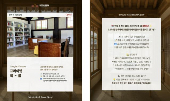 상주박물관은 시민들에게 조용하고 안정된 독서 환경을 제공하기 위해 전통의례관에 ‘프라이빗 북-룸’을 마련하고 운영을 시작한다.‘프라이빗 북-룸’은 전통 한옥의 고즈넉한 분위기 속에서 독서, 집필, 사색은 물론, 1~3인 규모의 북클럽 모임, 학부모 독서회, 소규모 동아리 활동 등 다양한 문화 활동이 가능한 맞춤형 공간이다. 예약 및 현장 신청으로 1회 최대 2시간까지 이용할 수 있으며, 운영 시간은 평일과 주말 모두 오전 9시부터 오후 5시까지 이다.윤호필 상주박물관장은 “이번 사업을 통해 전통 한옥과 책이 어우러지는 복합문화공간을 조성하고, 지역 내 책 중심 커뮤니티 기반을 마련해 향후 문화예술 소모임으로의 확장을 기대하고 있다.”라고 밝혔다.