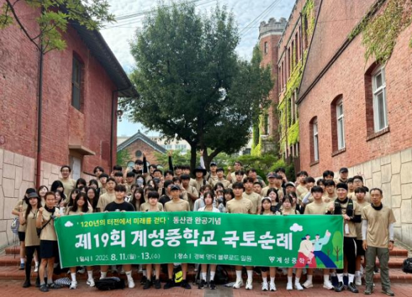 대구 계성중학교는 여름방학을 맞아 학생들에게 자신감과 인내심을 심어주고 지난 11일부터 13일까지 2박 3일의 일정으로 국토 순례를 진행했다.학생 63명과 교사 20명이 함께 한 이번 행사는 2박 3일의 일정으로 첫날 강구대교에서 영덕읍 국립 청소년해양센터까지, 둘째 날 포항 죽장옥계계곡, 셋째 날 강구면 삼사해상공원에서 남정면 장사해수욕장까지의 코스로 구성됐다.특히 참여자들은 행사 동안 세계지질공원에 다수의 명소가 포함된 블루로드를 종단하며 해안가에 펼쳐진 아름다운 절경을 두루 둘러봄으로써 국도의 지질학적 가치와 빼어난 경치를 경험했다.장영중 교장은 “선생님들과 학생들이 산불로 힘든 시간을 보내고 있는 영덕군민께 위로와 격려의 메시지를 전달하고자 순례와 함께 성금을 모아 전달하기도 했다”며, “올해까지 여섯 번 영덕 블루로드를 방문했는데 매번 안전하게 행사를 마칠 수 있도록 세심하게 지원해 주신 영덕군에 감사드린다”고 전했다.한편, 계성중학교는 1906년 미국 북장로의 선교사인 안의와 목사가 설립한 학교로, 이번 순례 중 별파랑공원 안에 있는 ‘블루로드 기도의 방’에서 산불 극복을 기원하는 기도행사를 열기도 했다.