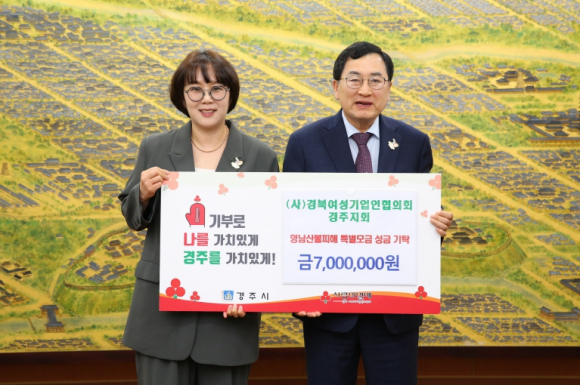 (사)경북여성기업인협의회 경주지회는 2025년 4월 28일, 영남지역 산불 피해 주민들을 돕기 위해 성금 700만원을 기탁했다.이번 성금 기탁 외에도, 협의회는 1천5백만원 상당의 의복을 기탁하여 이웃사랑 나눔에 큰 귀감이 되고 있다.경북여성기업인협의회 경주지회는 여성기업 대표들로 구성되어 있으며, 2004년 설립 이후 경주지역 여성기업인과 여성 근로자의 권익 향상과 지역 일자리 창출에 기여해왔다. 협의회는 매년 900만원에서 1,000만원의 성금을 기탁하며, 자연재난 발생 시에도 자원봉사 활동을 적극적으로 펼치고 있다.이윤지 회장은 “산불 피해로 고통받고 있는 이웃의 어려움을 헤아리며, 이웃사랑 정신을 실천하고자 회원들과 함께 준비한 성금이 피해 주민들에게 작은 위로가 됐으면 좋겠다”고 말했다.주낙영 경주시장은 “경북여성기업인협의회 경주지회의 따뜻한 이웃사랑 정신에 깊은 감사의 말씀을 전한다. 기탁된 성금은 피해 지역 주민들에게 큰 희망을 줄 것이며, 회원들의 따뜻한 마음을 잘 전달하도록 하겠다”고 말했다.