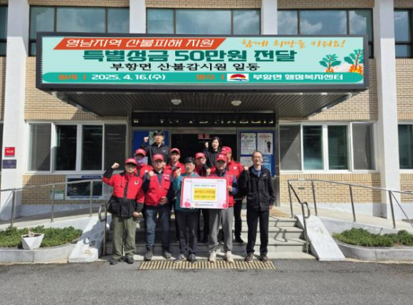 김천시 부항면 산불 감시원 10명은 지난 16일 영남 지역 산불 피해 지원을 위한 특별성금 50만 원을 전달했다. 부항면 산불 감시원들은 청정 부항의 소중한 자연을 보전하기 위해 아침부터 늦은 저녁까지 잠시도 쉴 틈 없이 산불 징후를 살피고 순찰을 다니며, 마을 주민과 등산객 대상 산불 조심 캠페인 등 예방 활동도 적극적으로 펼치고 있다. 감시원들은 산불을 경계하는 소임을 다하고 있기에, 영남 지역 산불 피해에 큰 아픔과 무거운 책임감을 느끼고 있다며, 이번 성금을 모으게 된 계기를 전했다. 이근보 반장은 “하루아침에 삶의 터전을 잃은 주민들의 아픔에 깊은 위로를 전하며 작게나마 힘이 되고 싶었다.”라며 “작은 정성이지만 이재민들이 하루빨리 일상으로 돌아갈 수 있기를 바란다.”라고 말했다. 이현기 부항면장은 “산불 감시원분들이 값진 마음으로 마련해 주신 이번 성금은 산불 피해 주민들에게 더 큰 힘이 될 것”이라며 “이재민들의 일상 회복과 지역사회 복구를 위해 소중히 쓰일 수 있도록 잘 전달하겠다.”라고 말했다.
