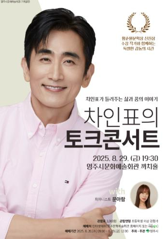 영주시문화예술회관은 오는 8월 29일 오후 7시 30분 까치홀에서 2025 기획공연 `차인표의 토크 콘서트(with 문아람)`를 개최한다고 밝혔다.이번 공연에는 제14회 황순원문학상 신진상 수상 작가이자 배우인 차인표가 무대에 올라 관객과 소통하며 자신의 책과 삶에 대한 진솔한 이야기를 들려준다. 여기에 피아니스트 문아람의 감성적인 연주가 더해져, 문학과 음악이 조화를 이루는 특별한 무대를 선사한다.총 90분간 이어지는 이번 콘서트는 세대와 장르를 넘어선 공감과 감동을 전달하며, 관객들에게 깊은 울림과 진정성 있는 소통, 그리고 치유의 시간을 함께할 수 있을 것으로 기대된다. 차인표의 삶과 작품 속 메시지는 문아람의 따뜻한 선율과 어우러져 하나의 완성도 높은 예술적 경험으로 이어질 전망이다.관람료는 전 좌석 3,000원으로, 초등학생 이상이면 누구나 관람할 수 있다. 예매는 8월 20일 오전 9시부터 8월 29일 낮 12시까지 영주시문화예술회관 누리집 또는 티켓링크를 통해 가능하다. 평일 오전 9시부터 오후 6시까지는 문화예술회관 사무실에서도 현장 예매를 받을 예정이다.공연과 관련한 자세한 사항은 영주시문화예술회관으로 문의하면 된다.영주시 관계자는 “이번 공연은 시민들이 문학과 음악을 통해 삶의 여유와 감동을 함께 나눌 수 있는 소중한 기회가 될 것”이라며, “앞으로도 수준 높은 문화예술 프로그램을 꾸준히 마련해 시민들의 문화 향유 기회를 확대해 나가겠다”고 말했다.