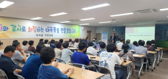 지난 8월 18일 대곡동행정복지센터에서는 주민 60여명이 모인 가운데 마을건강복지계획에 대한 사전설명회와 주민복지교육을 실시했다. 정연모 전문강사의 주도 아래 마을건강복지계획의 주요 내용과 향후 추진 방향에 대한 설명이 있었으며 주민들의 적극적인 참여와 관심을 유도하기 위한 프로그램이 마련됐다. 아울러 주민들에게 마을건강복지계획의 중요성과 실천 방안에 대한 알기 쉬운 설명을 통해 주민들의 이해를 도왔다. 본격적인 교육에 앞서 강진규 대곡동장은 인사말을 통해“이번 설명회와 주민복지교육이 주민 여러분께 마을건강복지계획의 중요성을 인식하고, 계획의 설계와 실천해 나가는 과정을 통해 주민들 간의 화합을 다지는 좋은 계기가 되리라 생각한다.”고 전했다. 아울러 대곡동 마을건강복지계획은 주민이 주인되어 마을의 문제를 발굴하여 주민주도의 실천 가능한 마을건강복지계획을 수립하기 위하여 앞으로 5차례의 간담회와 선포식이 있을 예정이다.