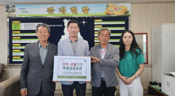 벽진면문화센터 운영위원회는 지난 24일 벽진면사무소를 방문하여 경북 지역 산불 피해 복구를 위한 성금 80만원을 전달했다. 벽진면문화센터는 2015년 개관된 이래로 지역주민들의 여가 및 문화생활을 위한 헬스반, 탁구반, 공예반 등 다양한 프로그램을 모범적으로 운영하여 지역민들의 만족도가 높으며, 타 지역의 벤치마킹 사례로 주목받고 있다.또한 벽진면문화센터 내 동호회 회원들이 매년 희망나눔캠페인에 성금을 기탁하는 등 나눔 활동을 이어가고 있으며, 이번 산불피해 특별 성금도 운영위원회에서 십시일반 모아 준비했다. 김쌍근 위원장은 “산불피해로 어려운 시기를 겪고 있는 이재민들에게 조금 이나마 도움을 드리고자 준비하게 됐고, 앞으로도 우리 지역 및 사회 곳곳의 아픔을 외면하지 않고 함께 동참하겠다.”고 말했다. 김창구 벽진면장은 “산불 피해 주민들을 위해 소중한 마음을 모아주신 김쌍근 위원장님과 위원님들께 진심으로 감사드린다.”며 “피해지역이 조속히 복구돼 주민들이 평범한 일상을 되찾기를 진심으로 바란다.”고 말했다.