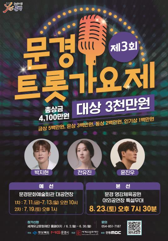 문경시는 오는 8월 23일 오후 7시 30분, 영강체육공원 야외공연장 특설무대에서 ‘제3회 문경트롯가요제’ 본선을 성대하게 개최한다고 밝혔다.이번 가요제는 문경시 주최, (재)세계유교문화재단 주관으로 전국에서 모인 총 731팀이 참가해 뜨거운 열기 속에 진행된 1·2차 예선을 통과한 11팀이 결승 무대에 올라 지자체 최대 규모인 대상 3,000만 원을 포함한 총상금 4,100만 원의 주인공을 가린다.본선에서는 경연뿐만 아니라 초대가수 박지현, 전유진, 윤진우, 윤윤서의 축하공연이 화려하게 펼쳐지고, 문경 홍보를 위해 디지털 영상·음향·무용 등을 결합해 문경의 문화·관광 자원을 예술적으로 승화한 미디어 퍼포먼스도 마련돼 관객들에게 다채로운 즐거움을 선사한다.특히 올해는 모바일 현장 투표로 관람객이 가요제 대상을 예측하는 특별 이벤트가 진행된다. 대상을 맞힌 참가자 중 추첨을 통해 소정의 상품을 증정함으로써 공연 분위기를 더욱 고조시키고, 단순 관람을 넘어 적극적인 참여 기회를 제공한다.신현국 문경시장은 “문경트롯가요제가 해를 거듭할수록 전국적인 관심과 참여를 이끌어내며 문경의 대표 문화 브랜드로 자리매김하고 있다.”라며, “올해도 참가자와 관객 모두가 즐길 수 있는 행사를 통해 문경의 매력을 널리 알리겠다.”고 말했다.
