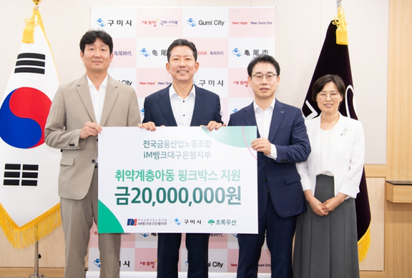 구미시는 8월 20일 전국금융산업노동조합 iM뱅크대구은행지부(위원장 백지노)로부터 여성청소년 보건위생용품 ‘핑크박스(PINK BOX)’ 120박스(2천만원 상당)를 전달받았다.핑크박스는 청소년 샴푸, 바디로션, 속옷세제, 여성위생용품 등으로 구성돼 있으며, 지역아동센터를 이용하는 여성청소년 120명에게 지원돼 건강한 성장과 일상생활에 보탬이 될 예정이다.iM뱅크대구은행지부는 전 직원이 급여의 1%를 모아 마련한 후원금으로 자립준비청년 지원, 취약계층 아동 겨울용품 후원, 인재양성 사업 등 경북지역 아동·청소년을 위한 다양한 나눔 활동을 이어가고 있다.김장호 구미시장은 “여성청소년에게 필요한 지원을 아낌없이 해주신 데 감사드린다”며 “iM뱅크대구은행지부의 따뜻한 마음이 잘 전달될 수 있도록 하겠다”고 했다.