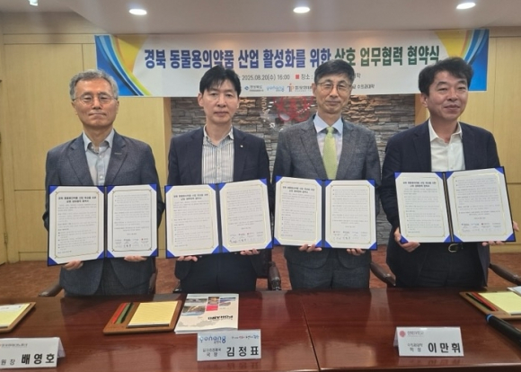 포항시는 20일 경북대학교에서 경상북도, 경북대학교 수의과대학, (재)포항테크노파크와 함께 ‘경북 동물용의약품 산업육성을 위한 업무협약(MOU)’을 체결했다. 이번 협약은 2023년 농림축산식품부가 발표한 ‘그린바이오 산업 육성 전략’에 따른 것으로, 동물용의약품을 포함한 유망 바이오 분야 산업화를 촉진하고 협력 거버넌스를 구축해 포항을 동물용의약품 산업 거점으로 육성하기 위해 마련됐다. 협약식에는 김정표 일자리경제국장을 비롯해 최혁준 경상북도 메타AI과학국장, 이만휘 경북대 수의과대학장, 배영호 포항테크노파크 원장이 참석했다. 포항에는 이미 ▲그린백신실증지원센터 ▲그린바이오 벤처 캠퍼스 ▲후보유전자 기반 첨단분석시스템 ▲동물용 그린바이오의약품 산업화 거점 등 다양한 인프라가 조성돼 있다. 시는 이번 협약을 계기로 이러한 기반을 적극 활용해 기술개발·기업지원·인재양성 등 전 주기적 지원 체계를 강화할 계획이다. 아울러 4개 기관은 ‘그린바이오 산업 육성지구’ 지정을 공동 목표로 협력해 포항을 비롯한 경북 지역의 바이오산업 경쟁력 강화와 글로벌 진출 기반 마련에 힘을 모으기로 했다. 김정표 일자리경제국장은 “동물용의약품 산업 육성을 위한 거점기관 간 협력을 확대해 지역 바이오산업을 활성화하고, 포항이 K-동물용의약품 허브로 도약할 수 있도록 적극 지원하겠다”고 말했다.