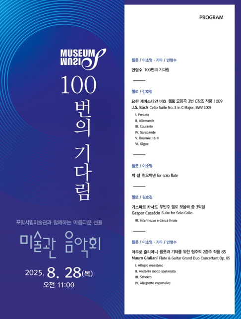 포항시립미술관은 오는 28일 제100회 미술관 음악회 MUSEUM&MUSIC ‘100번의 기다림’을 개최한다. 이번 음악회는 2014년 3월 첫 무대 이후 12년간 이어온 성과를 기념하고 시민과 함께 걸어온 여정을 돌아보는 뜻깊은 자리다. 미술관 음악회는 매월 마지막 주 수요일 ‘문화가 있는 날’과 연계해 꾸준히 이어져 왔다. 지금까지 380여 명의 연주자와 40여 개 단체가 참여해 성악·기악은 물론 생황, 반도네온, 엘렉톤 등 이색 악기 무대도 선보였다. 재즈밴드, 판소리 명창, 어린이 연주자까지 참여하며 장르와 세대를 아우르는 공연으로 발전했다. 2022년 이후에는 해마다 1,800여 명 이상이 관람하며, 누적 관람객은 1만 7천여 명을 넘어 포항시립미술관의 대표 문화 프로그램으로 자리매김했다. 이번 100회 음악회의 주제 ‘100번의 기다림’은 기타리스트 안형수가 특별히 작곡한 기념곡에서 따온 제목으로, 지난 12년간의 발자취와 앞으로의 도약을 상징한다. 공연은 기념곡 초연을 비롯해 바로크, 낭만주의, 한국 전통음악까지 폭넓은 레퍼토리로 구성되며, 포항시립합창단 임희도 사무장의 해설로 진행된다. 공연은 플루티스트 이소영과 기타리스트 안형수의 협연으로 기념곡 ‘100번의 기다림’을 시작으로 첼리스트 김호정의 바흐 ‘첼로 모음곡 3번 C장조’, 이소영의 플루트 독주 ‘한오백년’, 김호정의 카사도 ‘무반주 첼로 모음곡 3악장’, 이소영과 안형수의 줄리아니 ‘플루트와 기타를 위한 대협주적 2중주 Op.85’ 순으로 진행된다. 출연진으로는 경북대 교수 김호정(첼로), 미국 오벌린 음대 객원교수 이소영(플루트), 스페인 왕립음악원 출신 기타리스트 안형수가 참여해 수준 높은 무대를 선사한다. 포항시립미술관은 정례 음악회 운영으로 시민 누구나 일상 속에서 문화예술을 즐길 수 있도록 해왔으며, 이는 ‘문화가 있는 날’ 모범 운영 사례로 꼽힌다. 특히 2014년부터 꾸준히 개최해 ‘시민을 위한 미술관’ 이미지를 확고히 했고, 전국 공공미술관의 성공적인 문화 프로그램 모델로 평가받고 있다. 포항시립미술관 관계자는 “100회라는 숫자는 단순한 기록이 아니라 예술이 시민의 삶과 함께해 온 시간의 증거”라며 “앞으로도 시민과 함께 더 많은 감동의 무대를 이어가겠다”고 밝혔다. 이번 공연은 포항시민 누구나 무료로 관람할 수 있으며, 문의는 포항시립미술관으로 하면 된다.