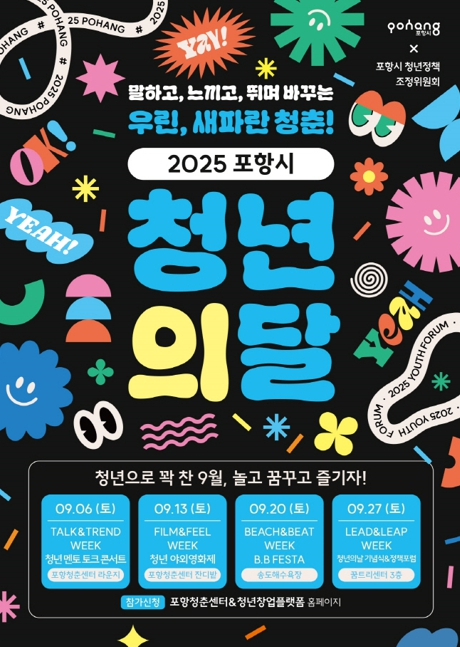 포항시는 청년 권리 보장과 사회적 관심 제고를 위한 법정기념일 ‘청년의 날’을 중심으로, 9월 한 달 동안 ‘2025 포항시 청년의 달–우린, 새파란 청춘!’을 운영한다. 올해 청년의 달은 기존 청년주간을 확대해 한 달간 이어지는 종합 축제로 기획됐다. 주차별 테마를 설정해 청년들이 참여·문화·소통·정책 제안을 한 자리에서 경험할 수 있도록 구성했다. 9월 6일 청년 주간의 첫 주에는 ‘Talk&Trend Week’가 열리며, K-직장인 멘토가 청년들에게 전하는 격려와 면접 노하우를 주제로 한 토크콘서트가 진행된다. 9월 13일에는 포항청춘센터 잔디광장에서 야외영화제 ‘Film&Feel Week’가 열려 청년들이 선호하는 영화를 함께 즐기며 감상을 나누고 교류하는 시간을 갖는다. 9월 20일 송도해수욕장에서 열리는 ‘Beach&Beat Week’의 B·B Festa는 청년들이 어울려 에너지를 발산하고 자유롭게 즐길 수 있는 참여형 축제로 마련된다. 마지막 주인 9월 27일에는 제2회 청년의 날 기념식과 청년포럼이 ‘Lead&Leap Week’의 메인 행사로 열린다. 지역 청년 4인의 개최선언을 시작으로 청년정책 발전에 기여한 청년들에 대한 시상과 기념 퍼포먼스가 진행되며 이어 청년들이 직접 정책을 제안하고 토론하는 포럼이 이어져 한 달간의 대장정을 마무리한다. 이날에는 청년 창업가들이 참여하는 ‘플플마켓’도 열려 다채로운 볼거리를 선사한다. 이와 함께 9월 24일부터 26일까지는 청년주간 프로그램이 포항청춘센터에서 별도로 운영된다. 힐링 필라테스, 건강 밥상 등 심신 건강 프로그램과 미국 주식 투자, 부동산 기초 교육 등 재테크 강연, 아로마·컬러테라피를 활용한 심리·힐링 클래스가 준비됐다. 청년의 달 주요 프로그램의 참여자는 포항청춘센터와 청년창업플랫폼 홈페이지에서 사전 모집하며, 참여를 원하는 포항 지역 청년 누구나 신청할 수 있다. 이강덕 포항시장은 “청년의 달은 단순한 기념행사가 아니라 청년들이 목소리를 내고 공감하며, 즐기고, 변화를 이끄는 장”이라며 “앞으로도 청년이 행복하고 지속가능한 미래를 그릴 수 있는 청년친화도시 포항을 만드는 데 최선을 다하겠다”고 밝혔다.