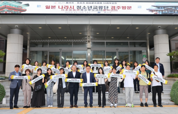 “한국 학교 급식, 정말 맛있어요!”지난 21일, 일본 나라시에서 온 청소년 20명이 경주에 도착해 2박 3일간의 특별한 여정을 시작했다. 경주시와 나라시는 올해 자매결연 55주년을 맞아 청소년 교류단을 꾸려 우정을 이어가고 있다.첫날 교류단은 김해공항에 도착하자마자 대릉원과 첨성대를 찾았다. 고대 신라 왕릉과 천문대를 직접 본 학생들은 “교과서에서 보던 유적이 눈앞에 있다”며 감탄을 쏟아냈다. 저녁에는 송호준 부시장을 예방하고 환영 만찬에 참석한 뒤, 동궁과 월지를 야간에 둘러보며 황홀한 야경을 만끽했다.둘째 날에는 화백컨벤션센터를 찾아 내년 열릴 APEC 정상회의장을 견학했다. 이어 경주여고에서 열린 환영식에서는 학생들이 일본 노래 ‘오카에리’, ‘타다 키미니 하레’를 부르고, K-팝 댄스팀의 무대가 이어지며 분위기가 최고조에 달했다. 이어진 급식 체험에서는 한국 학교 급식을 처음 맛본 나라시 학생들이 “메뉴가 다양하고 맛있다”며 엄지를 치켜세우는 장면이 이어졌다. 이후 양국 학생들은 배드민턴을 치고, 영어·과학 수업을 함께 참관하며 금세 친구가 됐다.하이라이트는 홈비지트. 경주여고 학생 16명과 나라시 학생 20명이 짝을 이뤄 36개 가정에서 하루를 함께 보냈다. 언어는 달랐지만 저녁식사를 함께하고 가족사진을 찍으며 “마음은 통한다”는 걸 확인했다. 저녁 일정으로 찾은 황리단길에서는 아이스크림을 들고 인증샷을 남기며 젊은 감각의 골목길을 즐겼다.마지막 날에는 국립경주박물관을 둘러본 뒤 귀국길에 올랐다. 짧은 일정이었지만, 양 도시 청소년들은 잊지 못할 추억을 남겼다.송호준 부시장은 “청소년들이 함께 웃고 배우며 쌓은 우정이 양 도시의 미래 55년을 이어갈 것”이라며 “이번 교류가 양국의 이해와 우정을 더욱 깊게 다지는 계기가 되길 바란다”고 말했다.